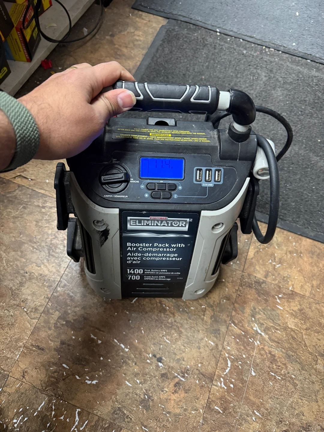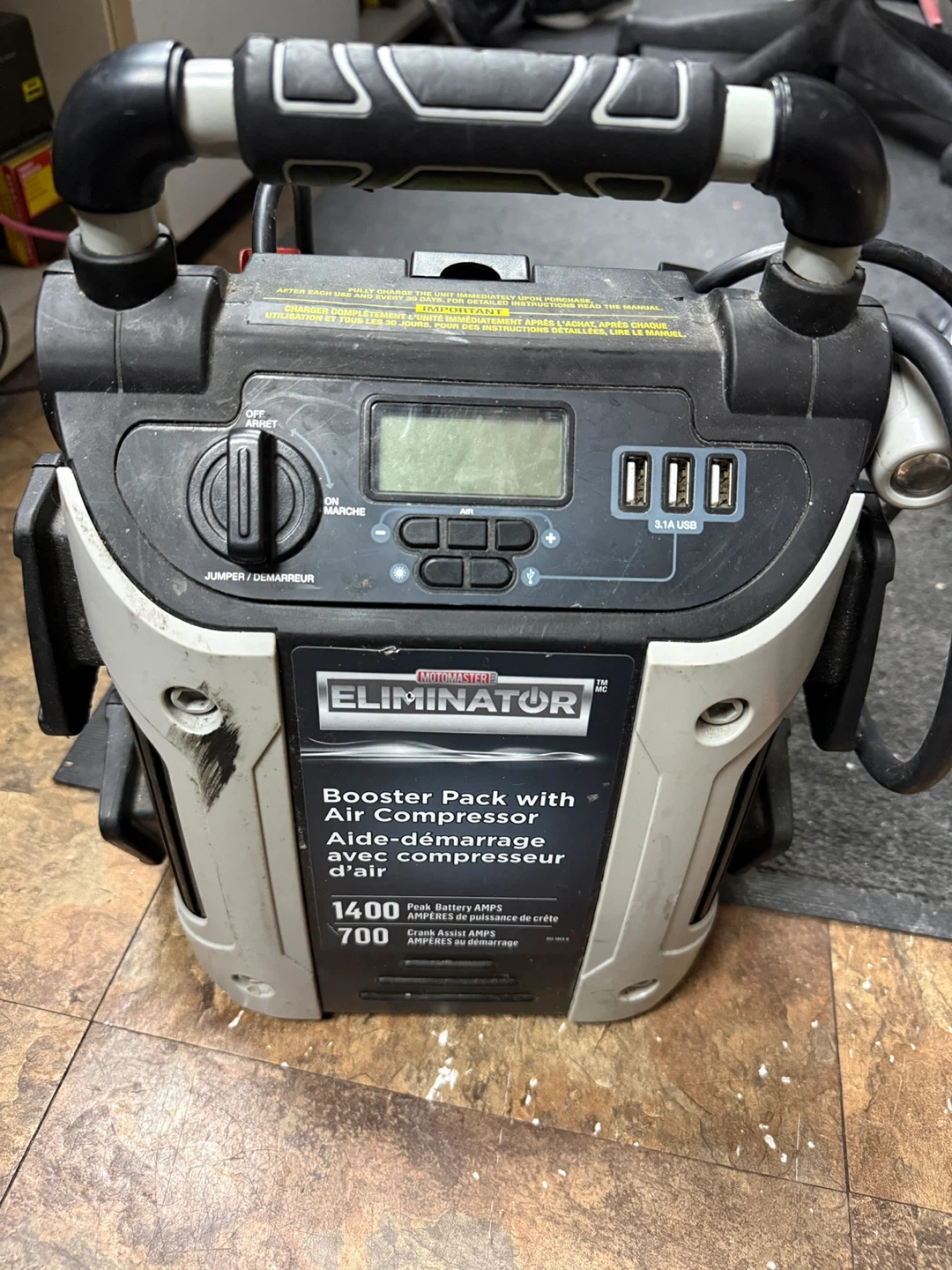 Selling a MotoMaster Eliminator booster pack and jump starter with an auto-stop digital air compressor. It delivers 1000 peak amps at 12V. Originally bought for $159.99.