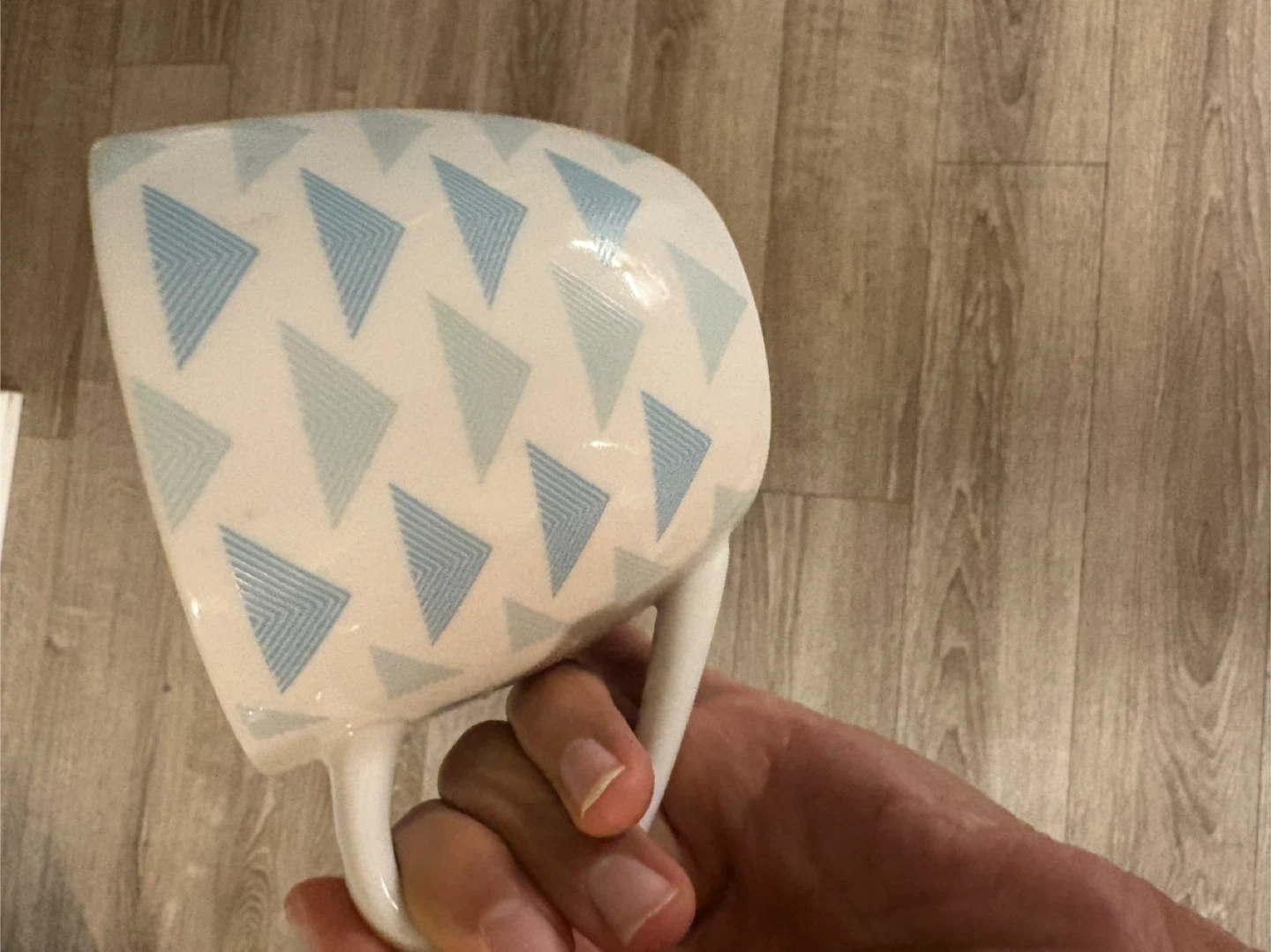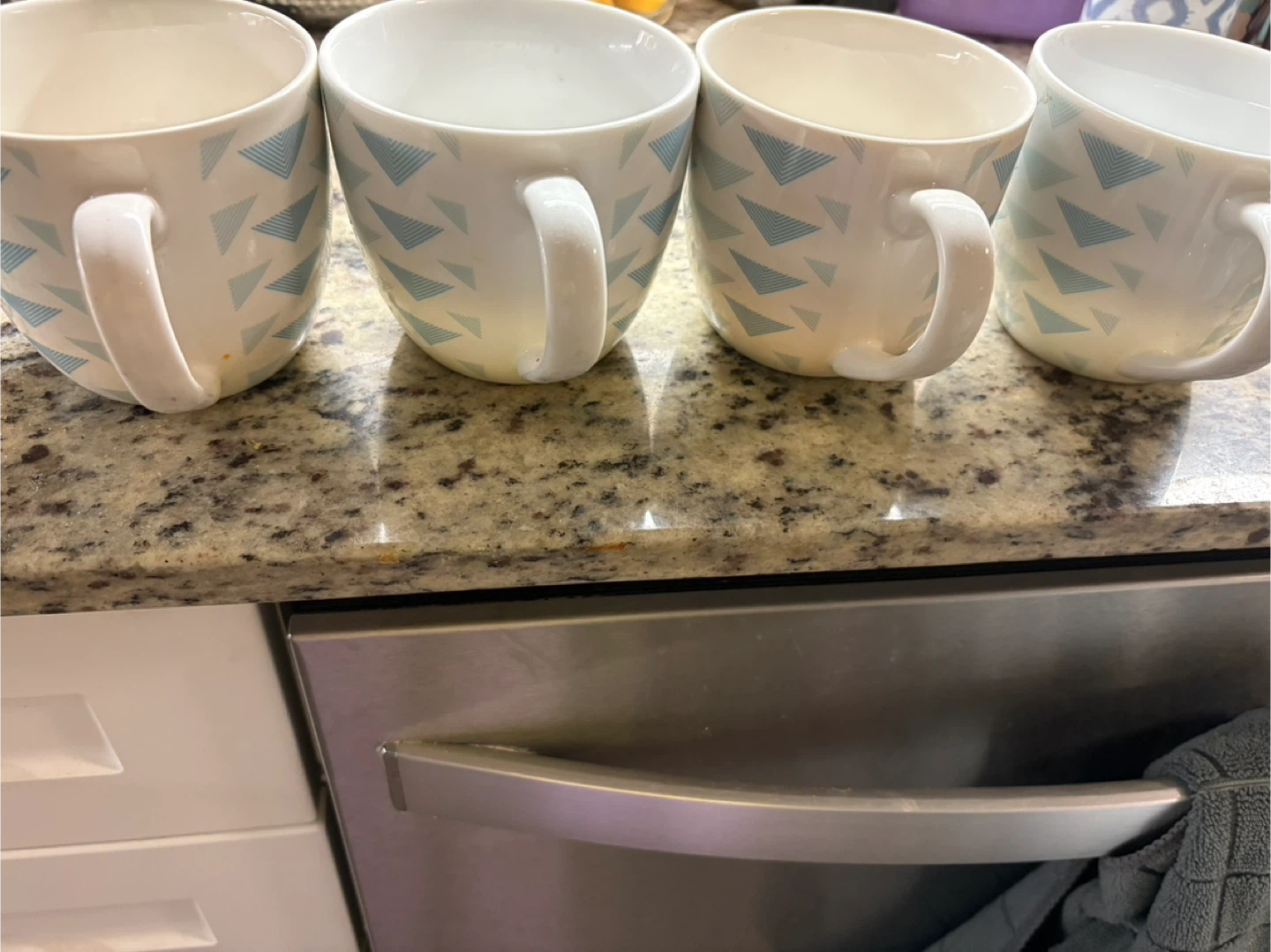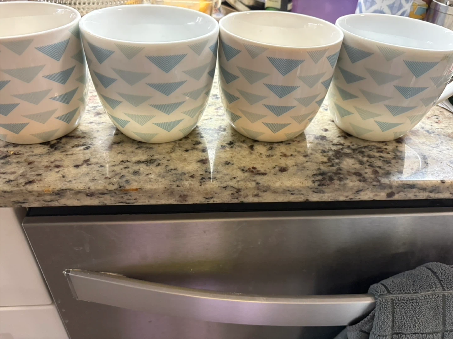 Selling a set of four coffee mugs! They're white with a cute blue triangle pattern. Perfect for your morning coffee or tea with friends