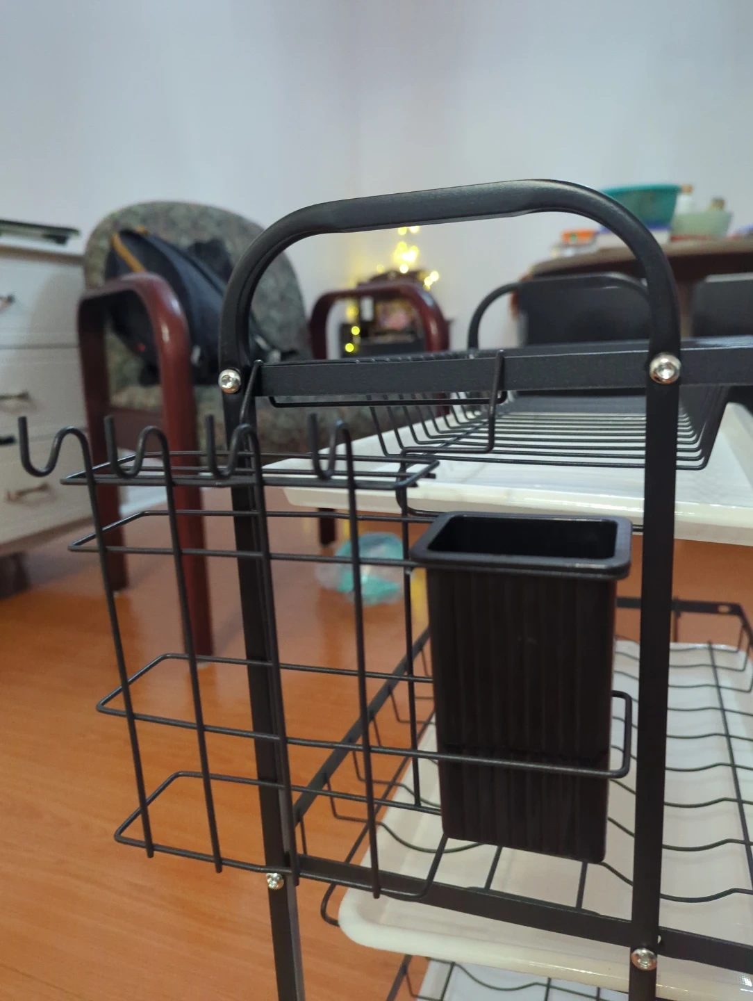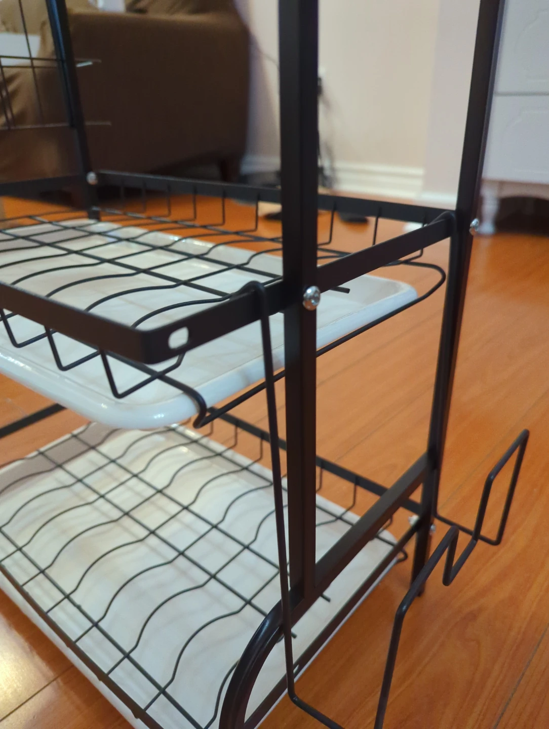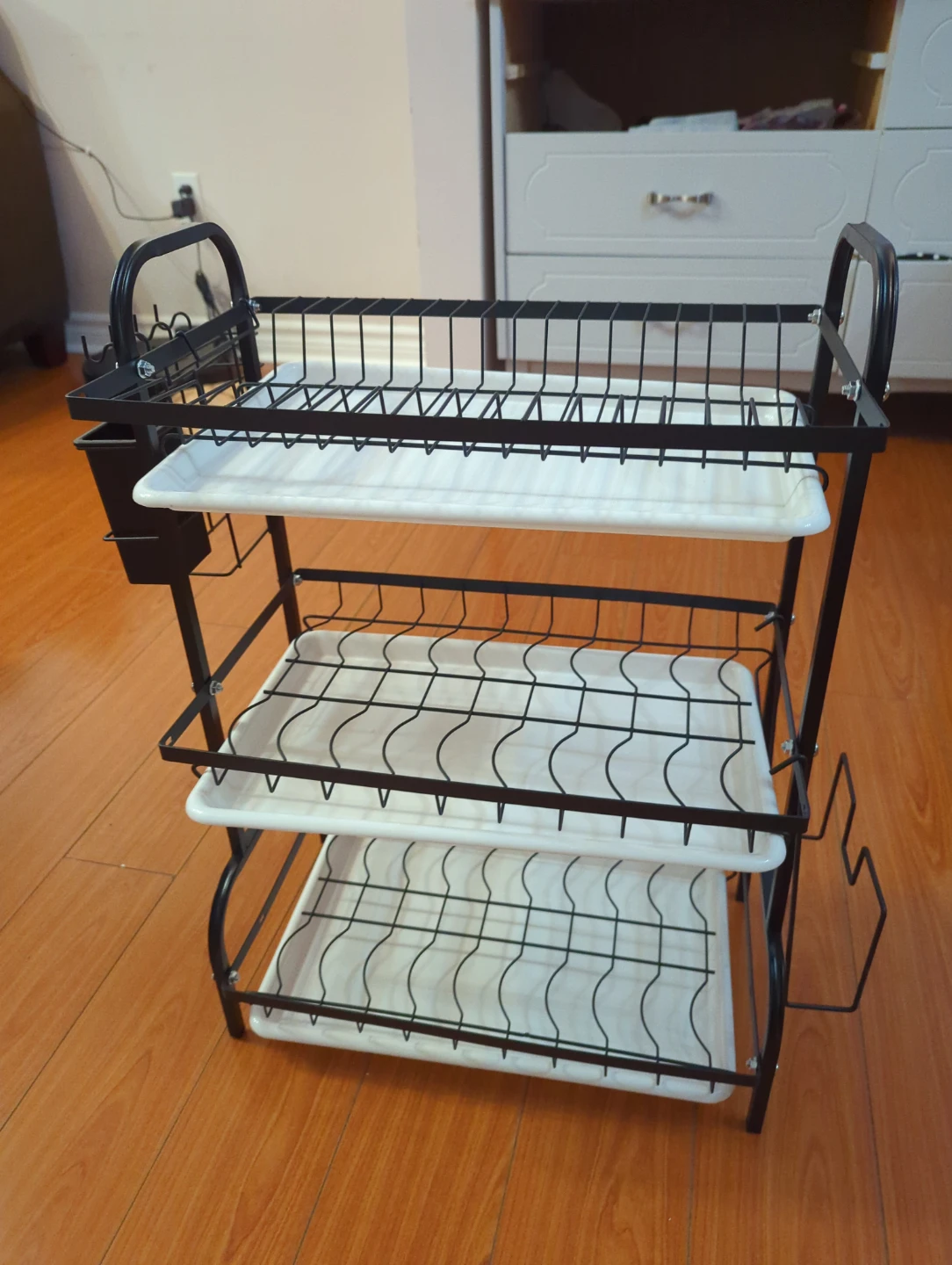 Selling a black, 3-tier dish drying rack. It's new, I ordered it from Amazon but it's too big for my kitchen. It's in great shape and ready to help keep your kitchen organized! It features a sturdy metal frame with three tiers for drying dishes, utensils, and more. The rack also includes a utensil holder and a tray to catch excess water. Perfect for any kitchen!