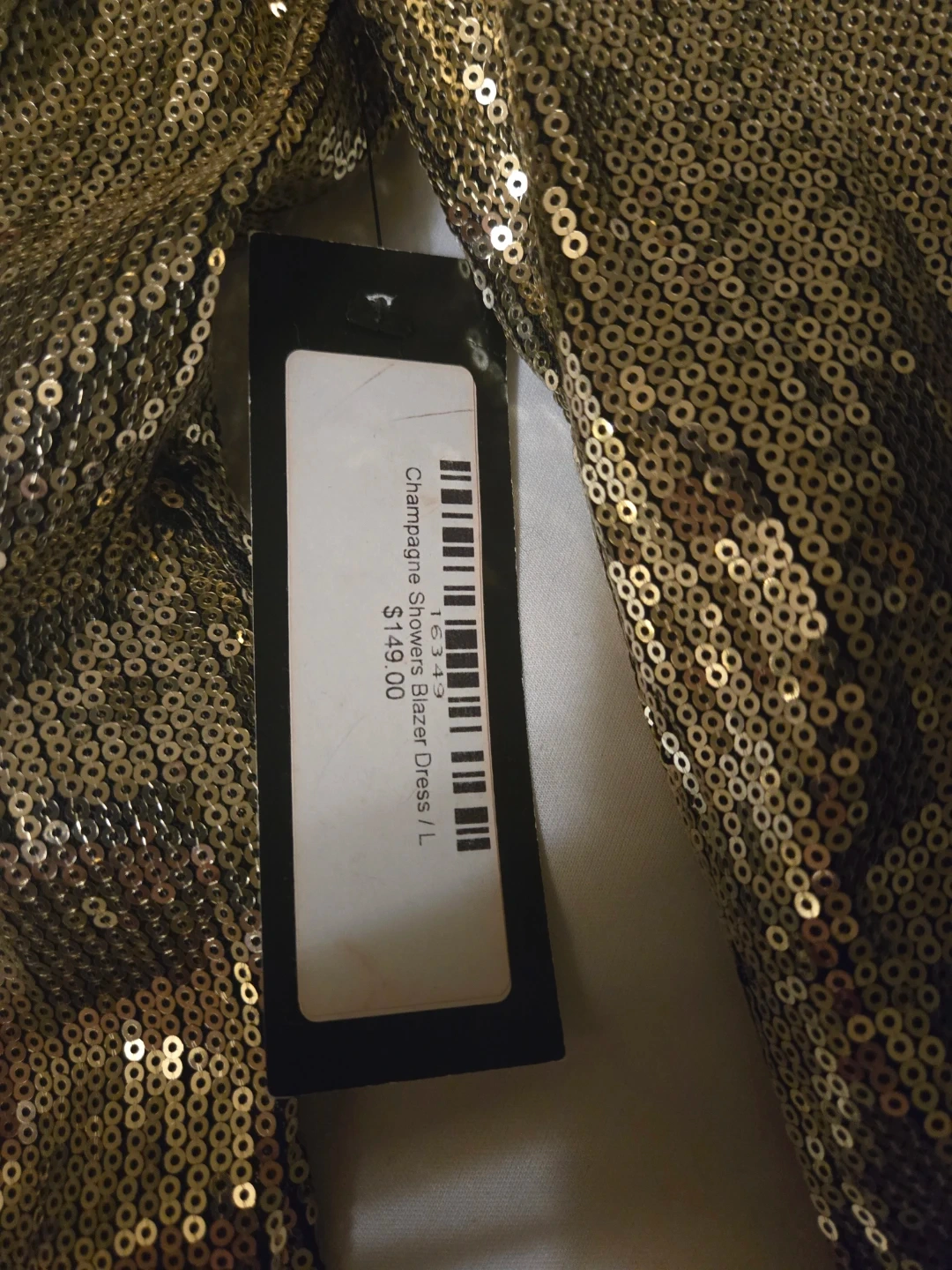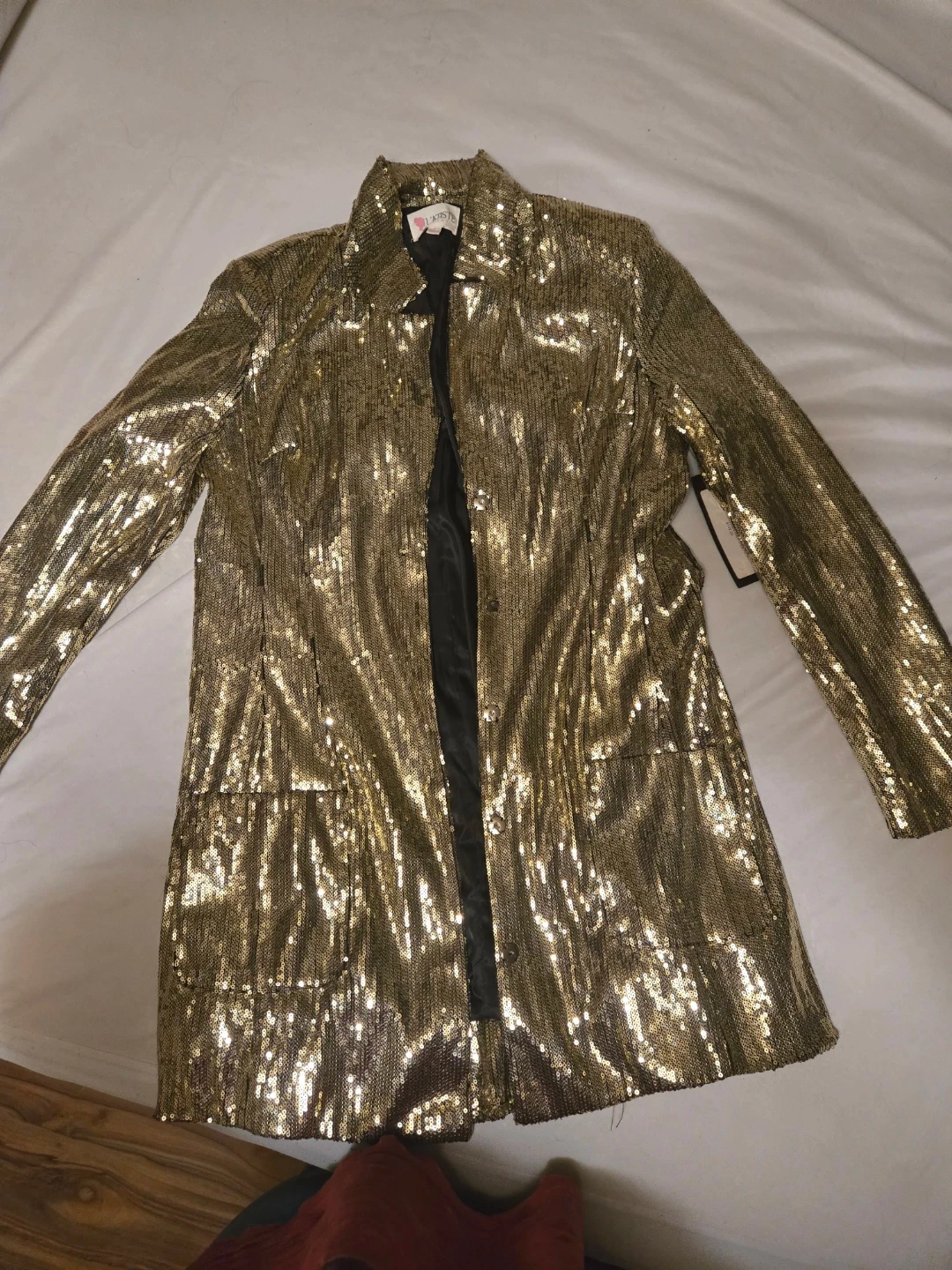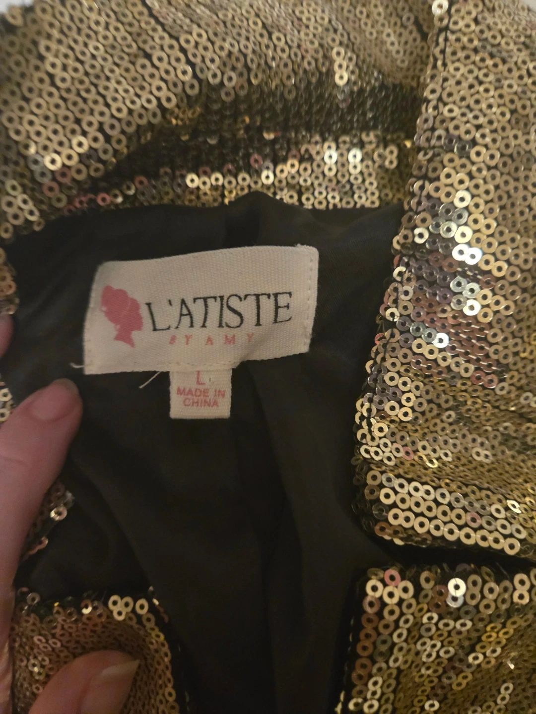 Selling a L'Atiste 'Champagne Showers' sequin blazer dress in size L. It's a beautiful piece with a shimmering gold sequin design. Originally bought for $149.00!