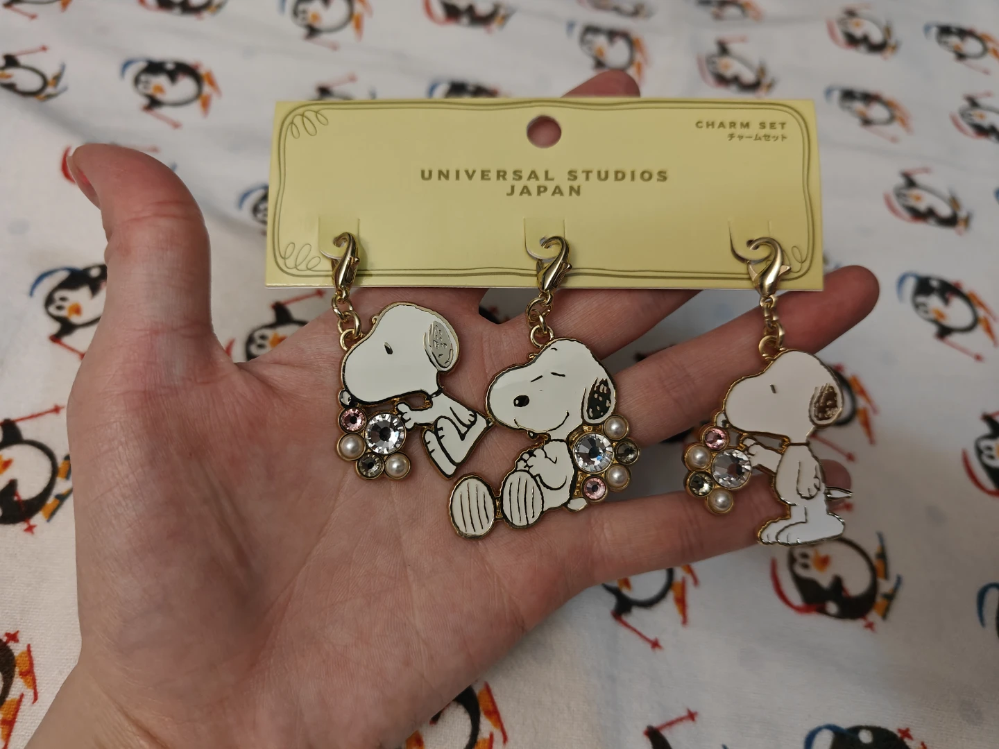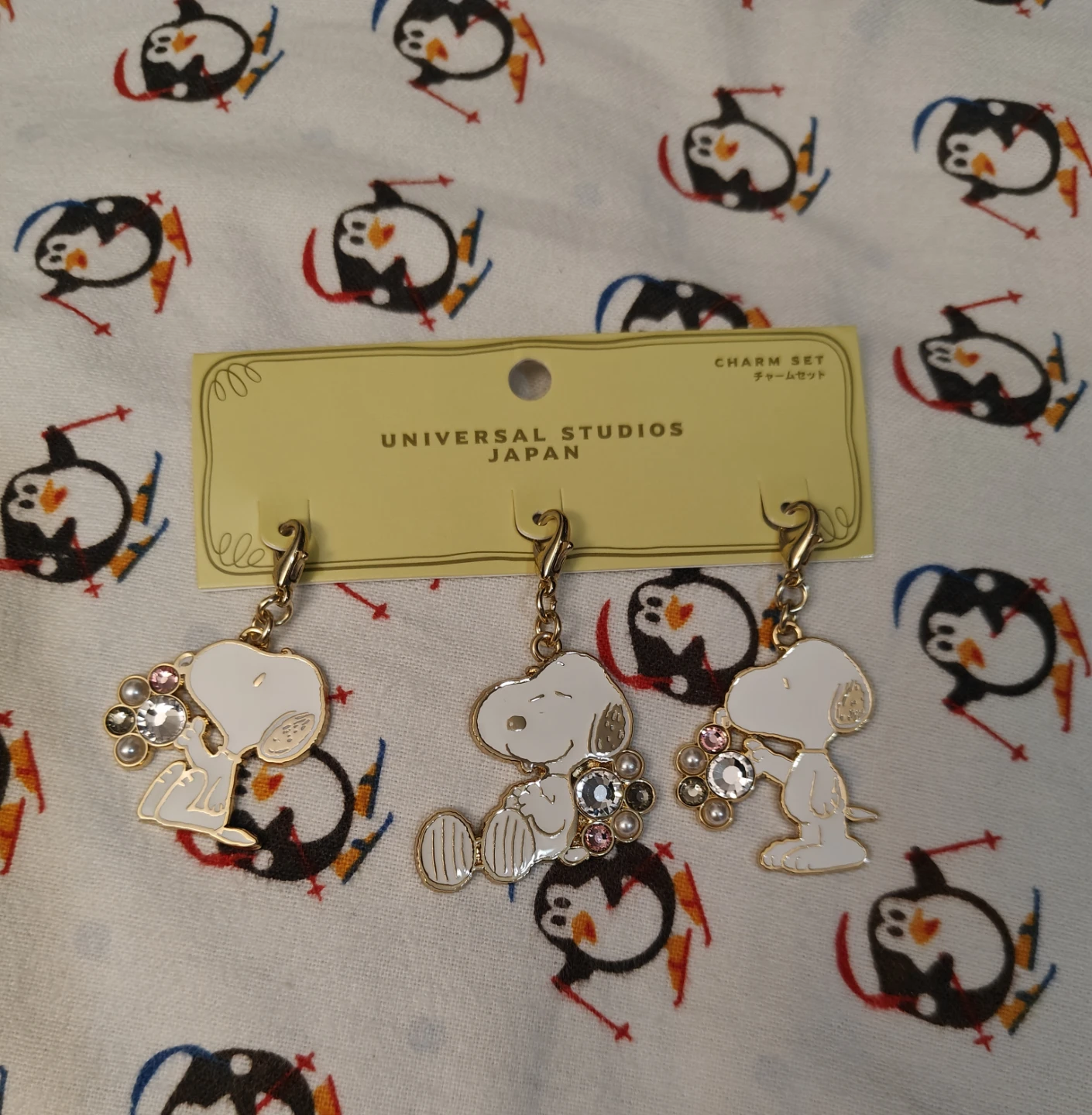 Here's a cute Snoopy charm set from Universal Studios Japan! It features three adorable Snoopy charms, perfect for adding a touch of fun to your accessories.
