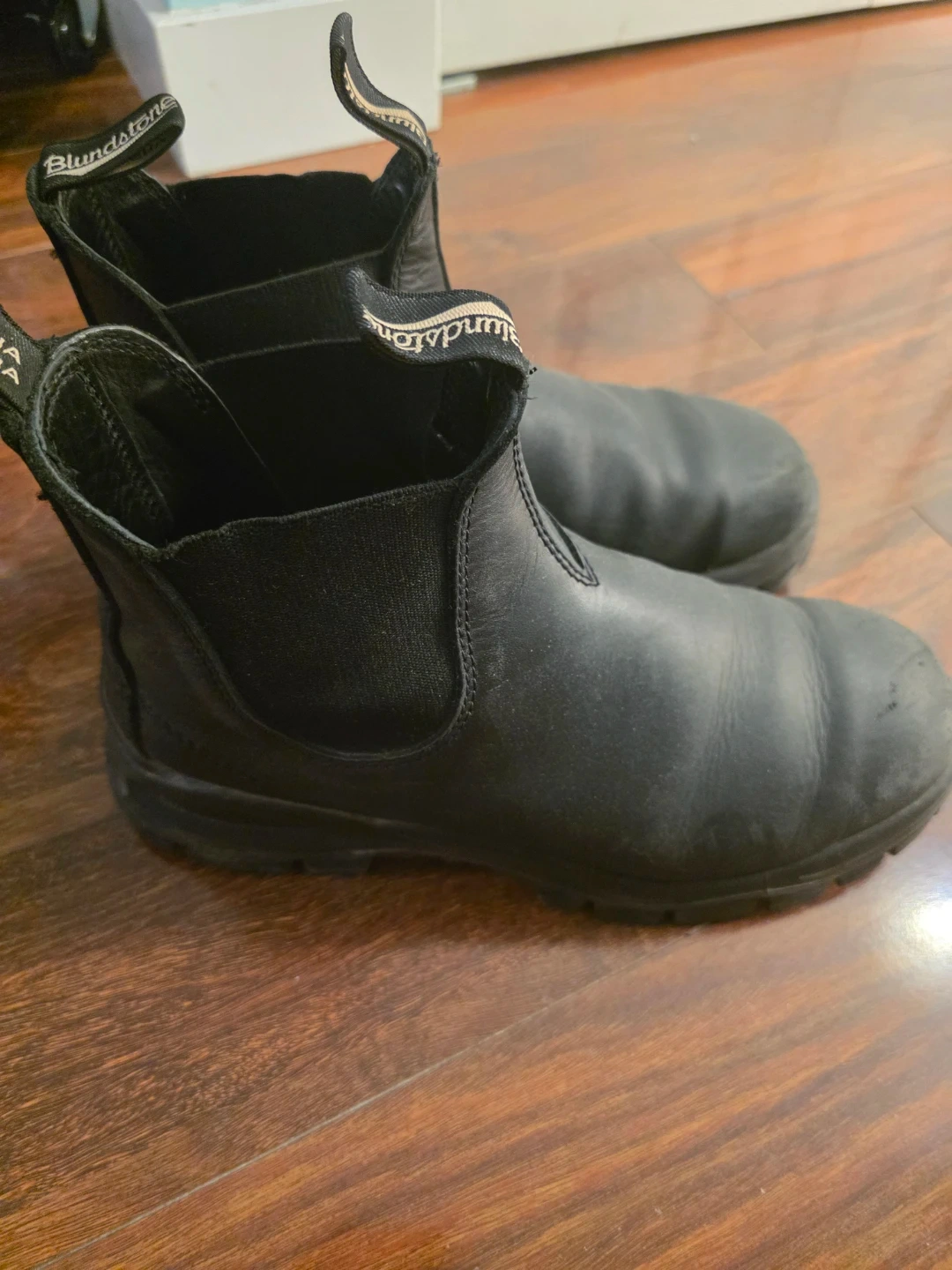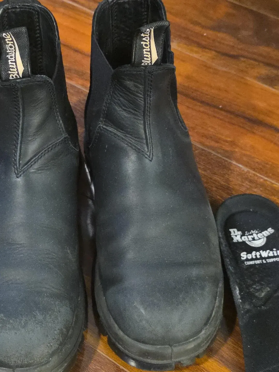 Selling a pair of Blundstone 500 boots in black leather. They're in good condition and ready for a new owner. The boots are comfortable and durable, perfect for everyday wear. Includes Dr. Martens SoftWair insoles.