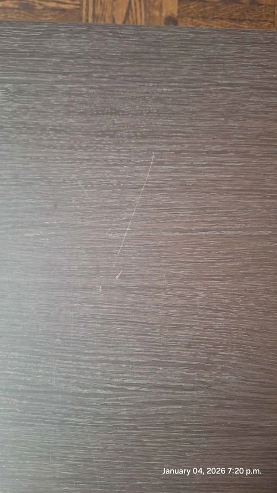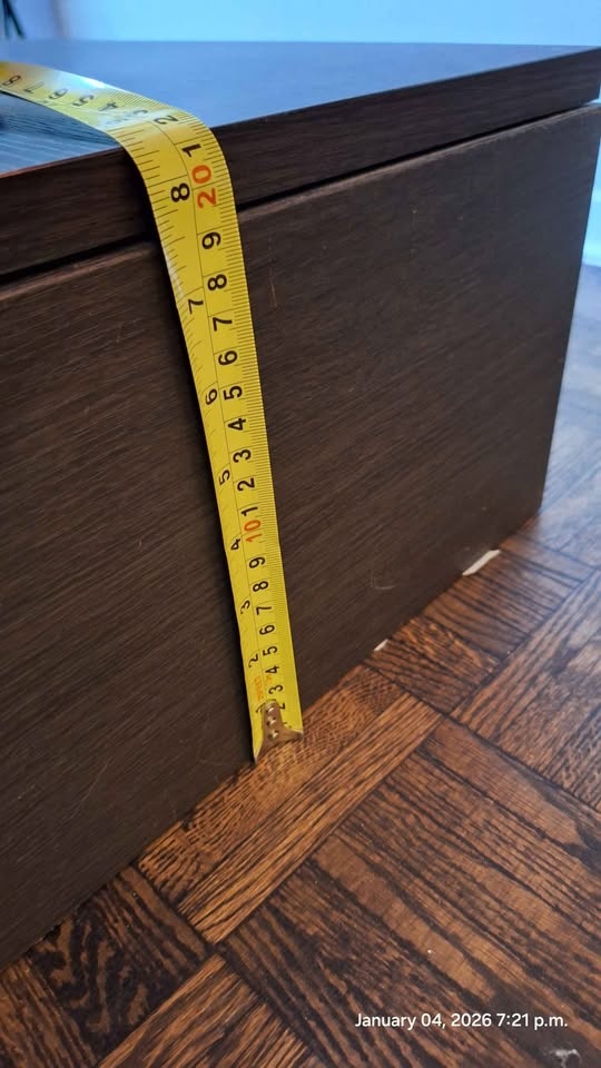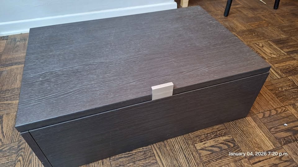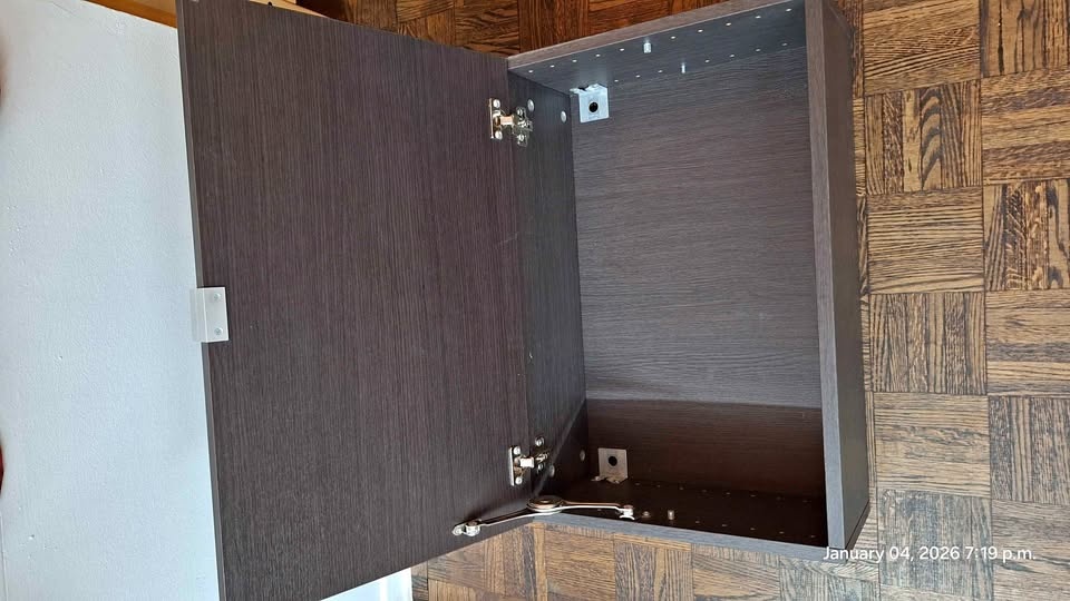 Selling a sleek, modern wall-mounted floating cabinet in a dark brown/espresso wood-grain finish.