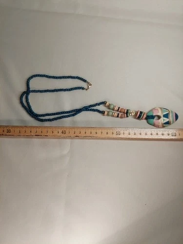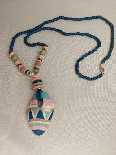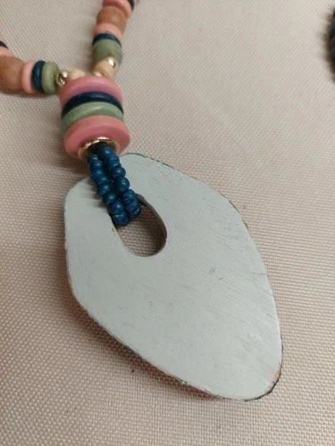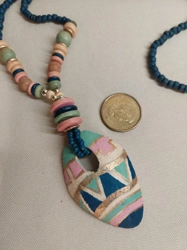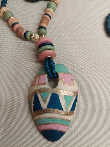 Beautiful boho-style beaded necklace featuring a hand-painted geometric pendant in soft shades of blue, turquoise, pink, cream, and gold. The pendant has an organic, artisan-made appearance and is complemented by layered beads in coordinating pastel and earth tones.