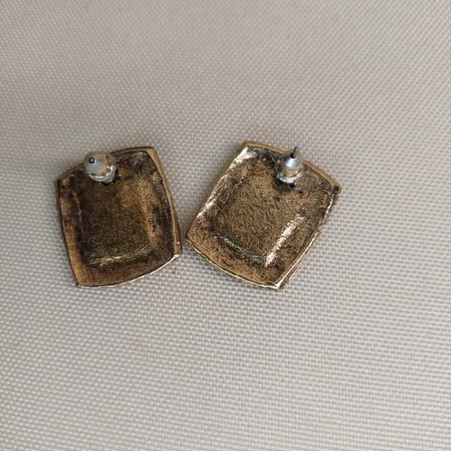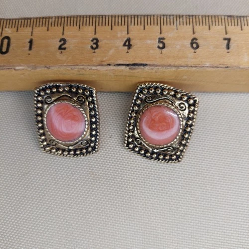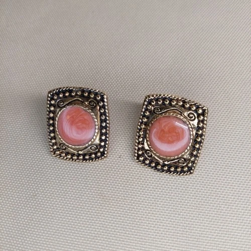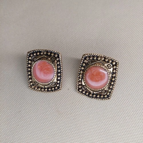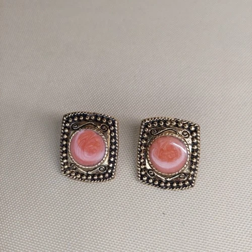 Beautiful vintage gold-tone stud earrings featuring soft pink swirl cabochon centers set in an ornate square frame with beaded and scroll detailing. These earrings have a lovely retro look and catch the light beautifully.