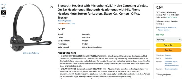 Caymuller wireless mono on-ear headset (Bluetooth 5.1) designed for clear calls and all-day comfort—ideal for work-from-home, call centers, trucking, online meetings (Skype/Teams), and hands-free daily use. Gently used with light signs of normal use only. Fully functional and well cared for. Includes the original retail box. You’re welcome to test pairing and call audio at pickup.