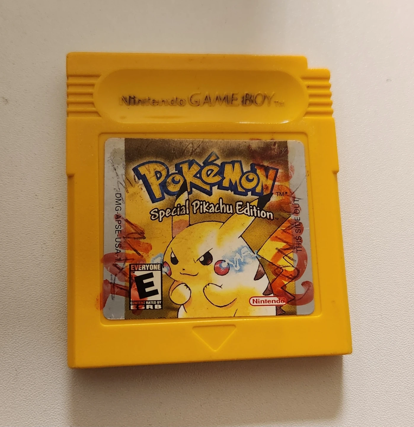 Selling a used Pokémon Special Pikachu Edition game cartridge for the original Nintendo Game Boy. The cartridge is yellow. Please note that the label has some wear and there is writing on the back of the cartridge. It includes the system to plug it in the tv