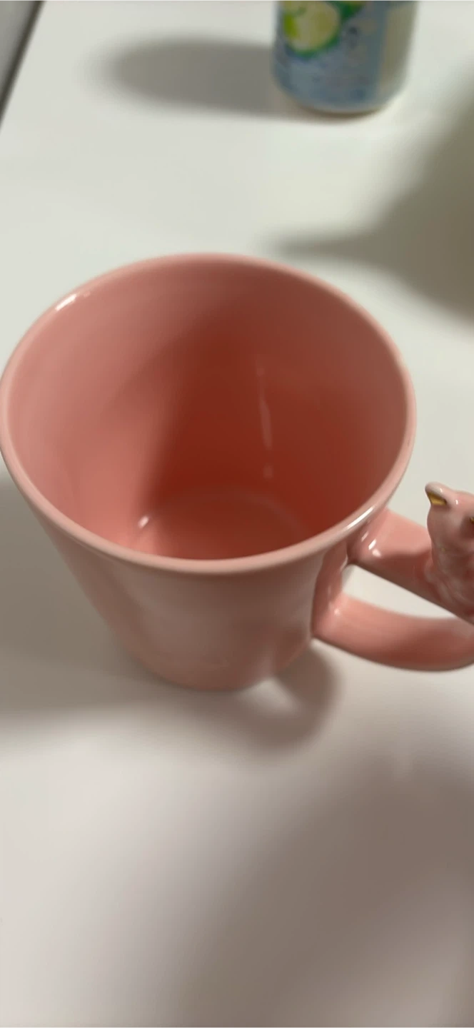 Selling a cute pink mug with a cat design and a matching lid! It's in great condition and would be perfect for tea or coffee. The mug is a lovely shade of pink and features a charming cat figure on the handle. It also comes with a lid to keep your drink warm
