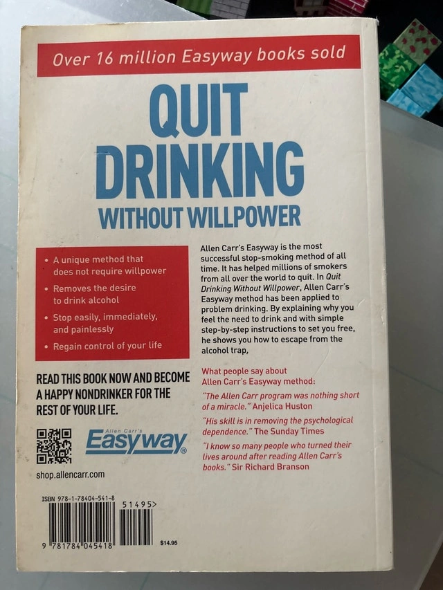 Dive into Allen Carr's "Quit Drinking Without Willpower," a transformative guide designed to help you break free from alcohol's grip. This book offers a unique method to stop drinking easily and painlessly, as seen in the images provided. Key features include: