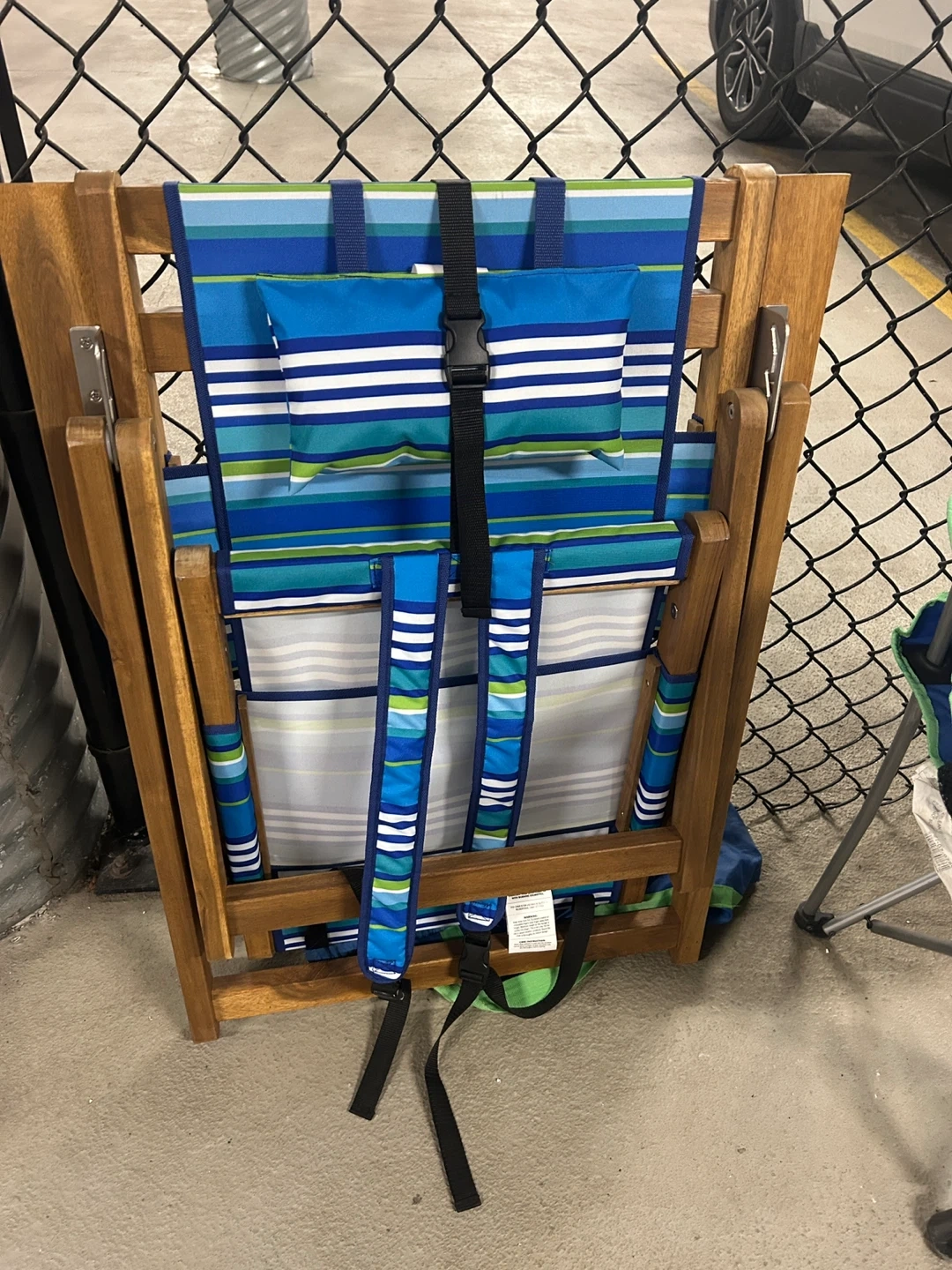 Selling a folding beach chair with a wooden frame and blue, green, and white striped fabric. It features backpack straps for easy carrying and a small pillow for added comfort. Perfect for patios, beach days or relaxing outdoors!