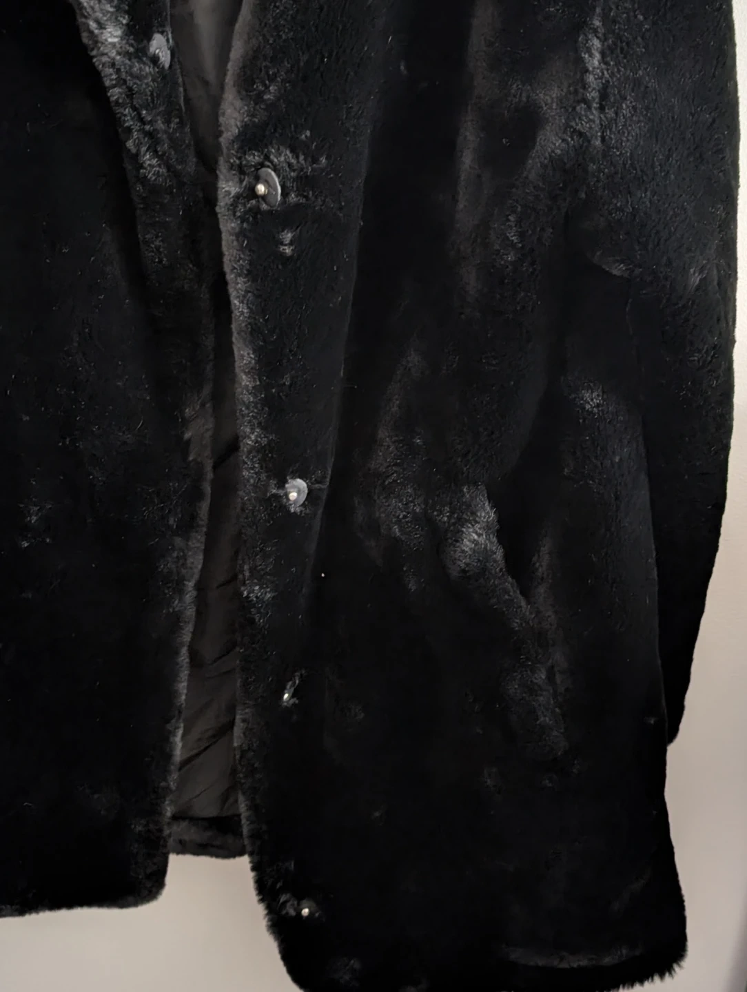 Here's a super cozy black faux fur coat! It's in great condition and perfect for adding a touch of warmth and style to any outfit. The material is soft and plush, making it comfortable to wear.