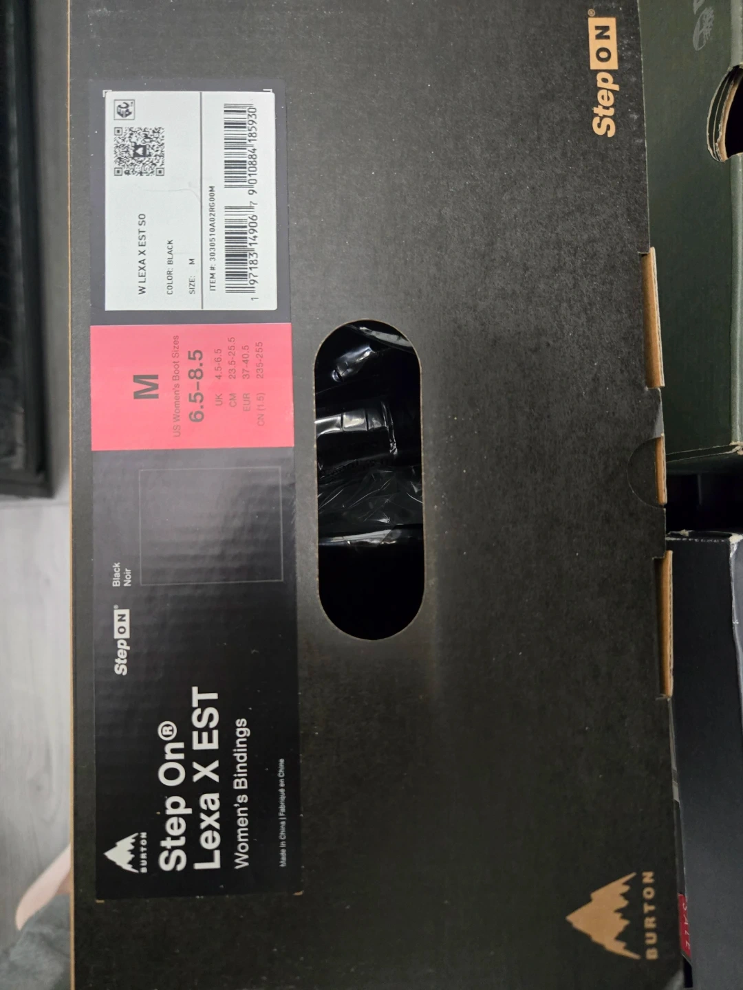 Selling a pair of Burton Step On Lexa X EST women's snowboard bindings in black, size M. These bindings are designed for ease of use and performance on the slopes. They come in the original box.