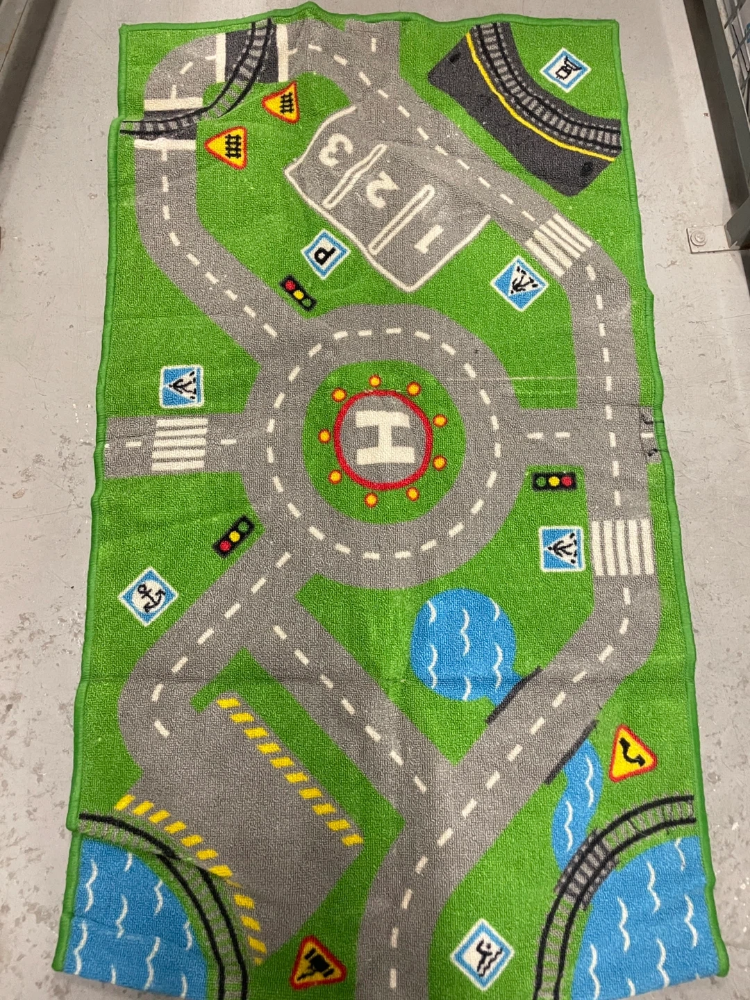 This is a fun play mat with a road pattern! It's perfect for kids who love cars and trucks. The mat features roads, a roundabout, a helipad, water features, and various road signs. It's in great condition and ready for a new little driver!
