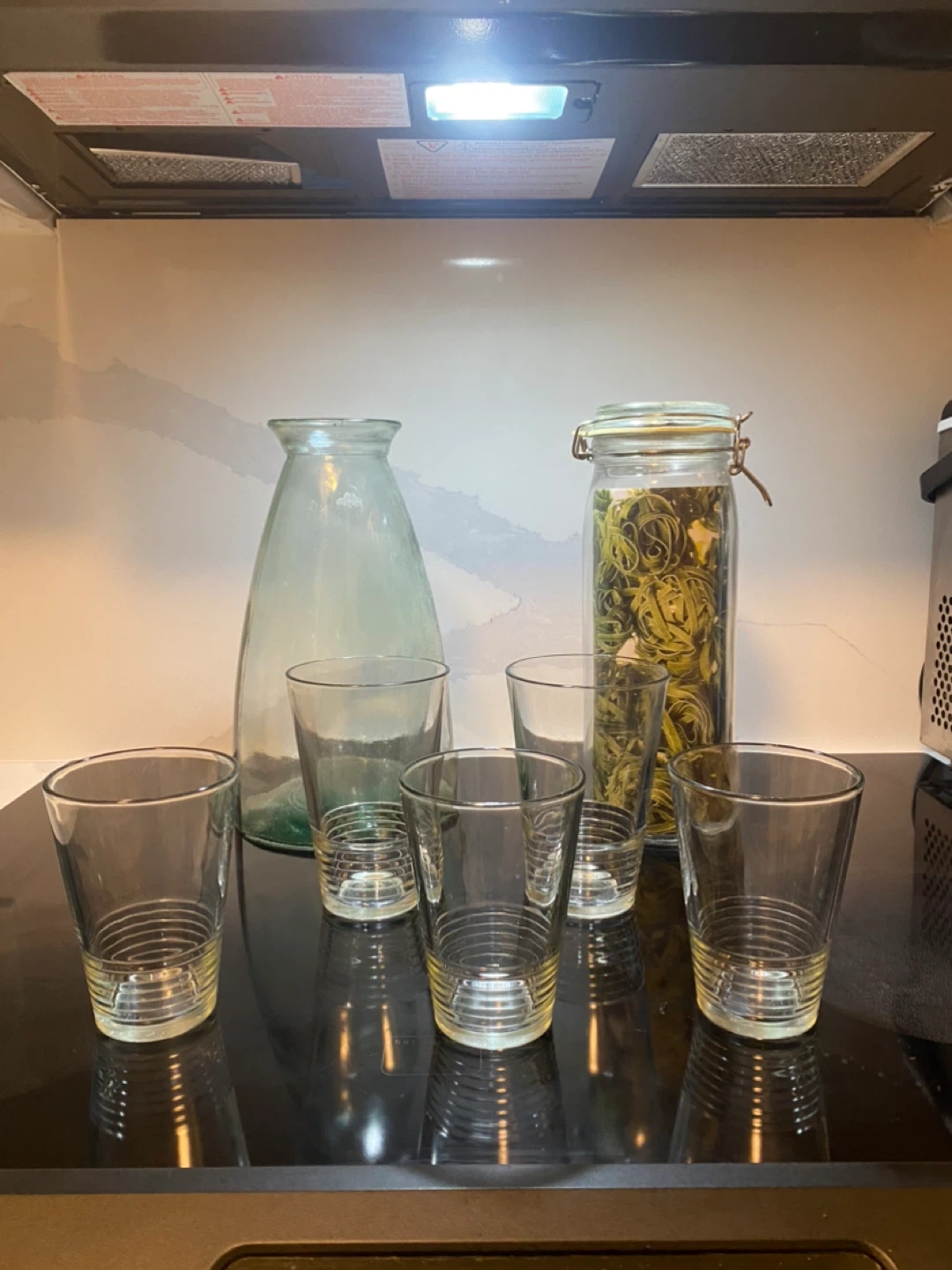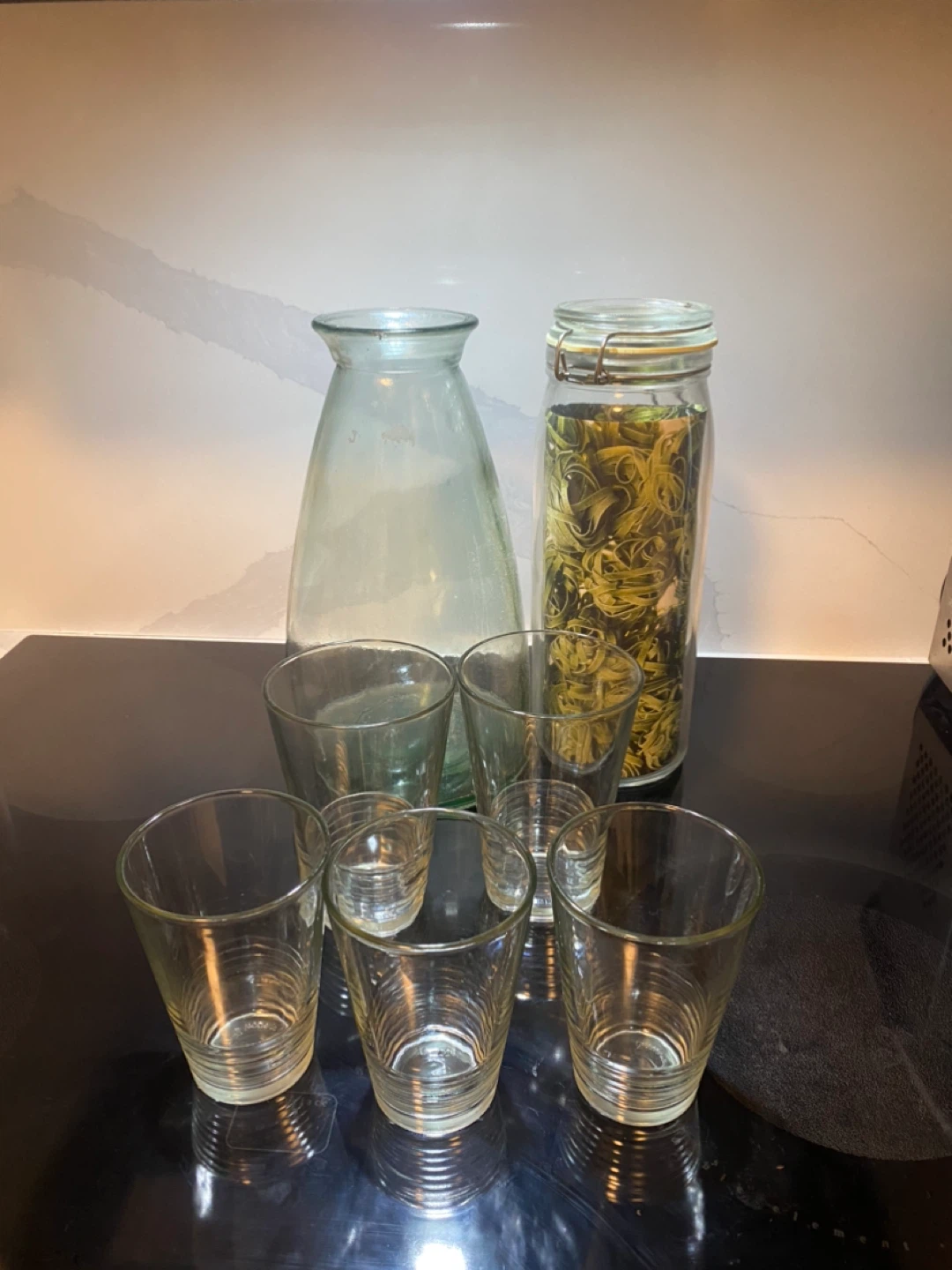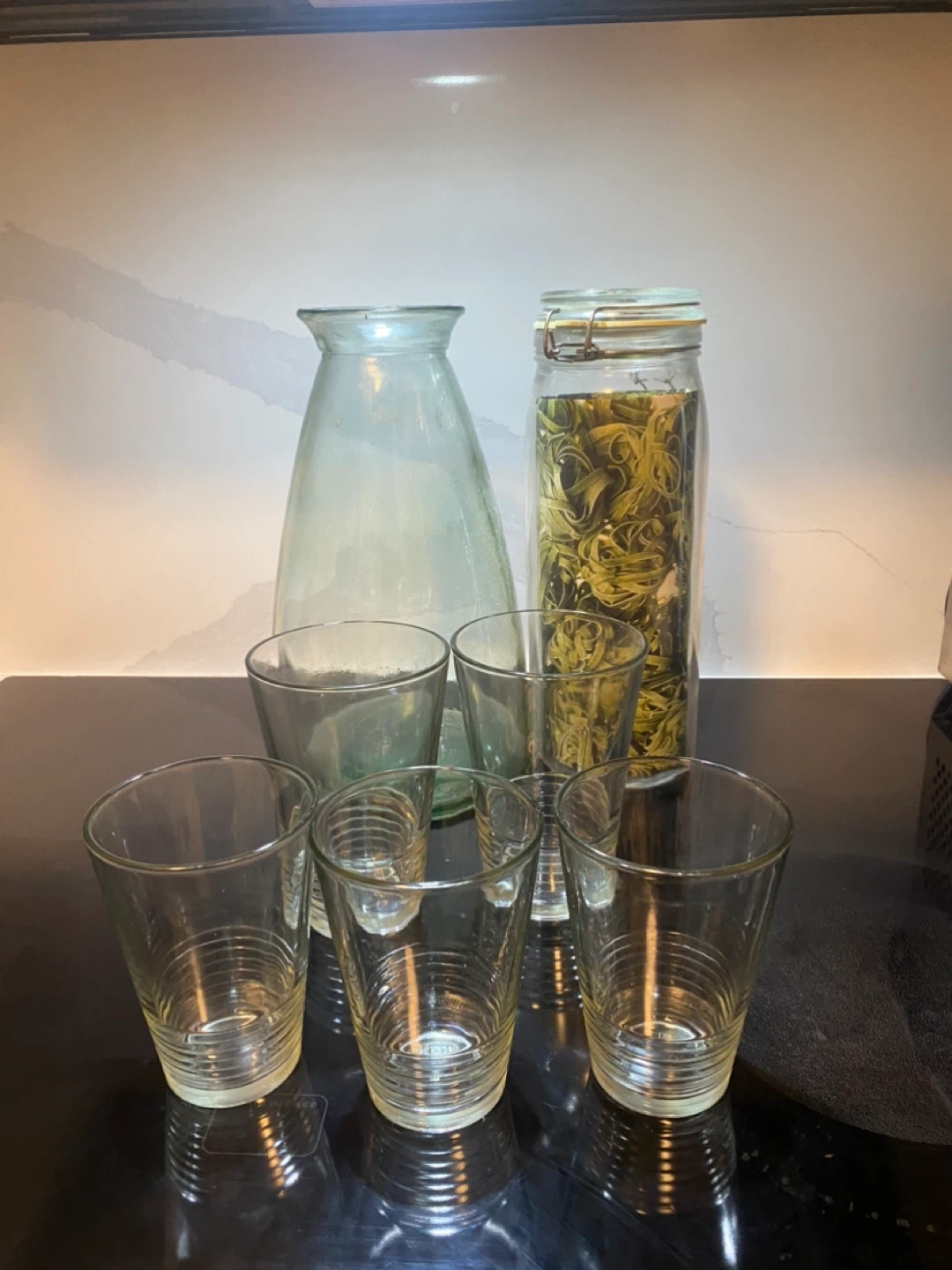 Selling a charming glassware set perfect for adding a touch of elegance to your home! The set includes a lovely vase, a jar, and six matching glasses. They're in great condition and ready to brighten up your space