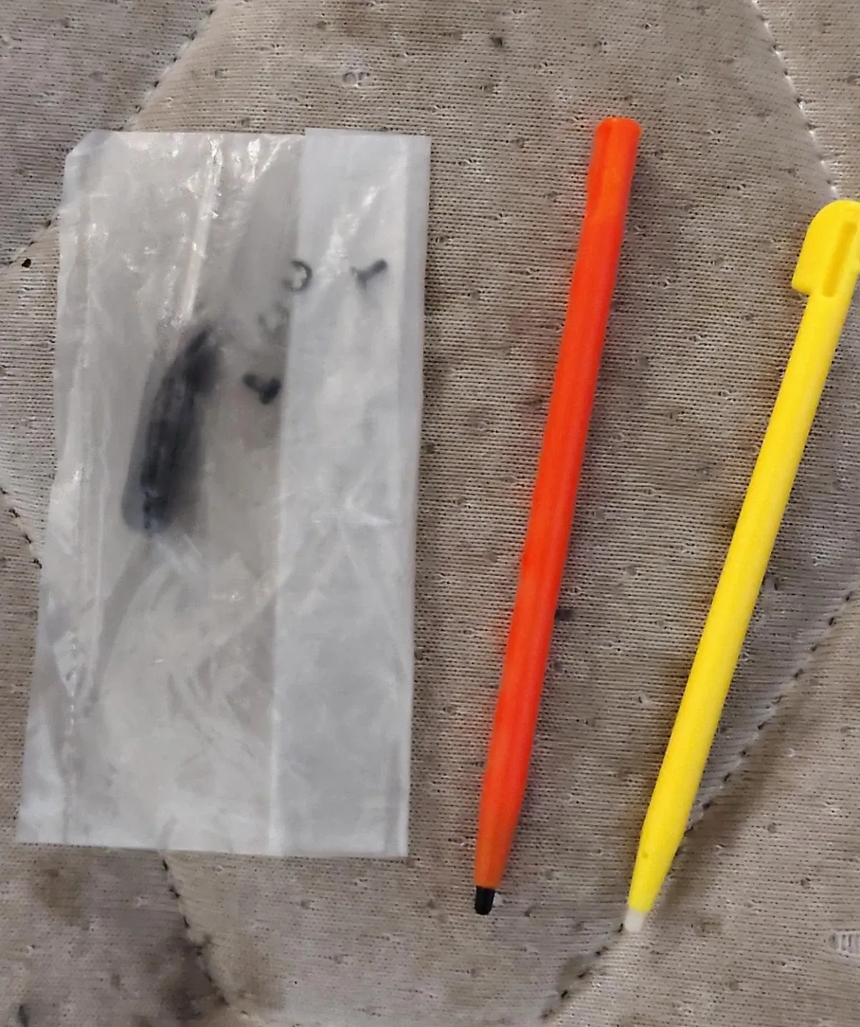 Selling a set of stylus pens, one orange and one yellow. Also included is a sealed package of extra tips for the pens for the Nintendo DS