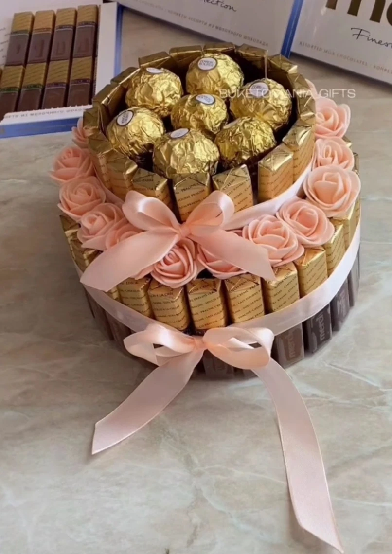 This is a beautiful chocolate bouquet featuring Ferrero Rocher and other assorted chocolates, decorated with delicate roses and a lovely ribbon. It's the perfect gift for any chocolate lover!