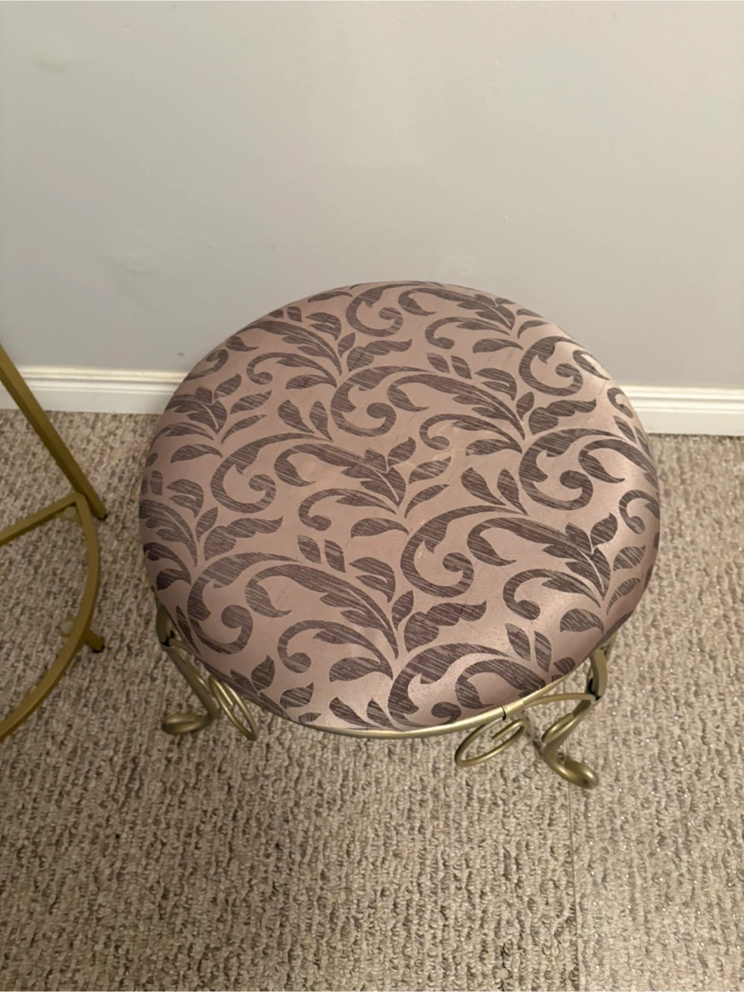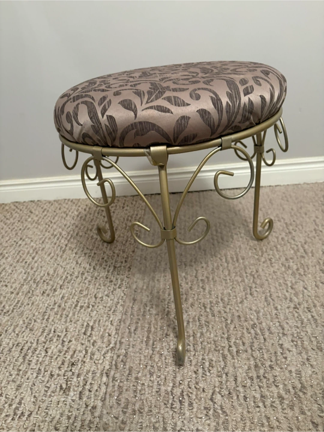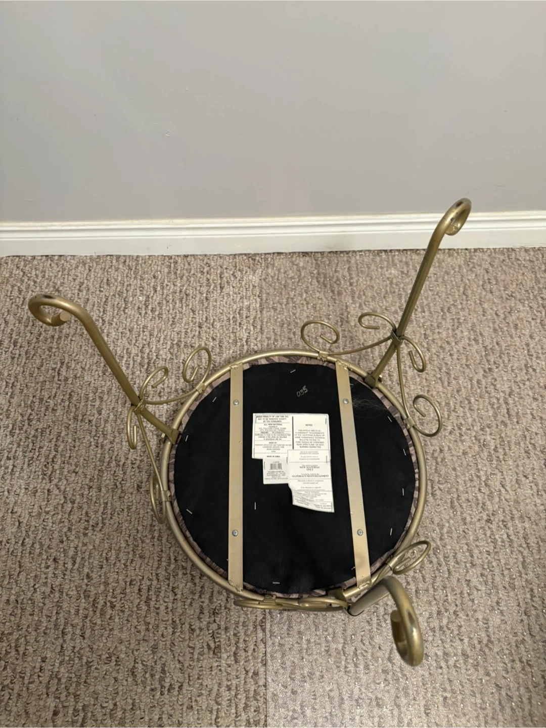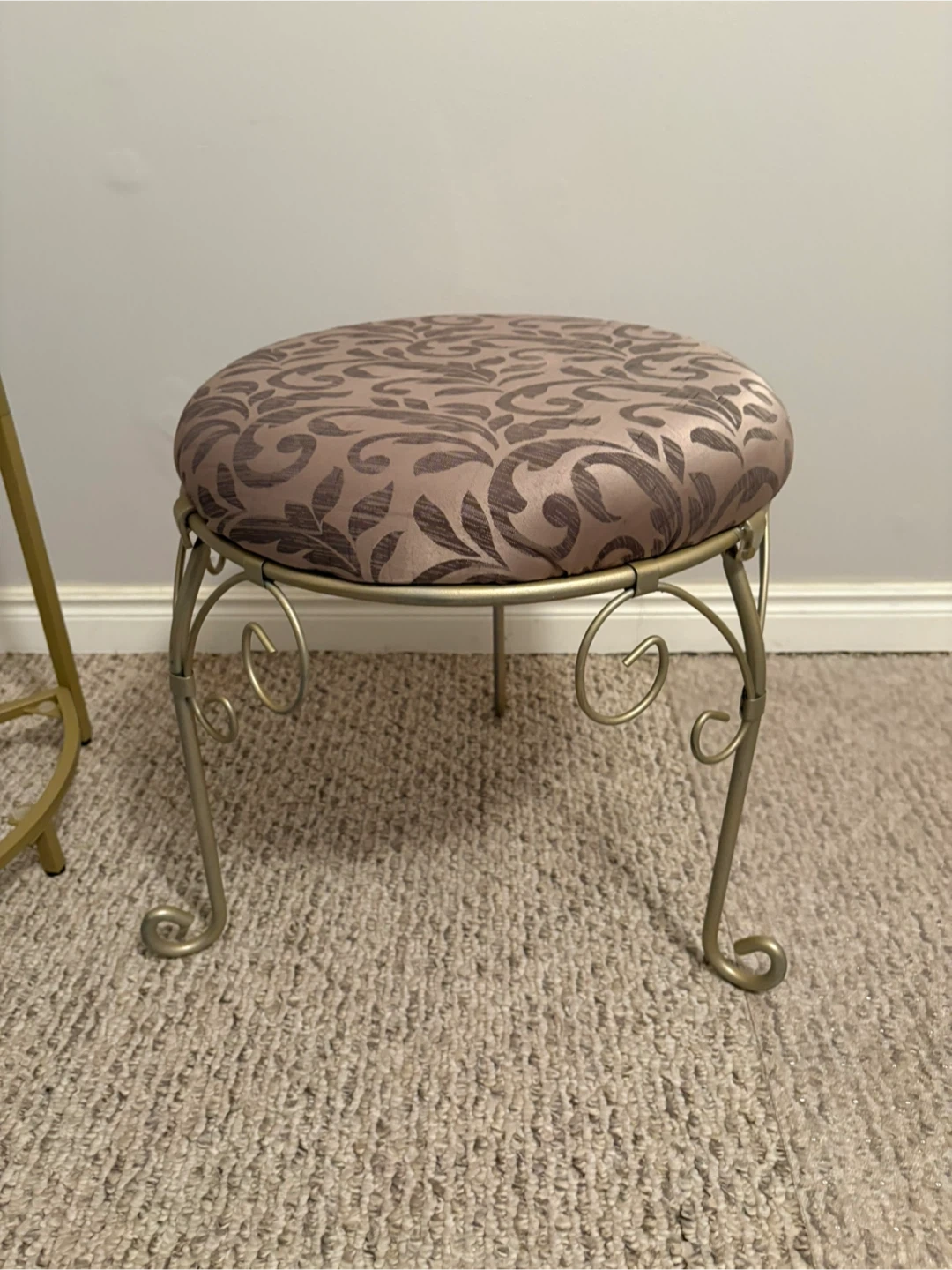 Selling a cute little accent stool! It has a metal frame with a patterned upholstered seat. Perfect for adding a touch of elegance to any room.