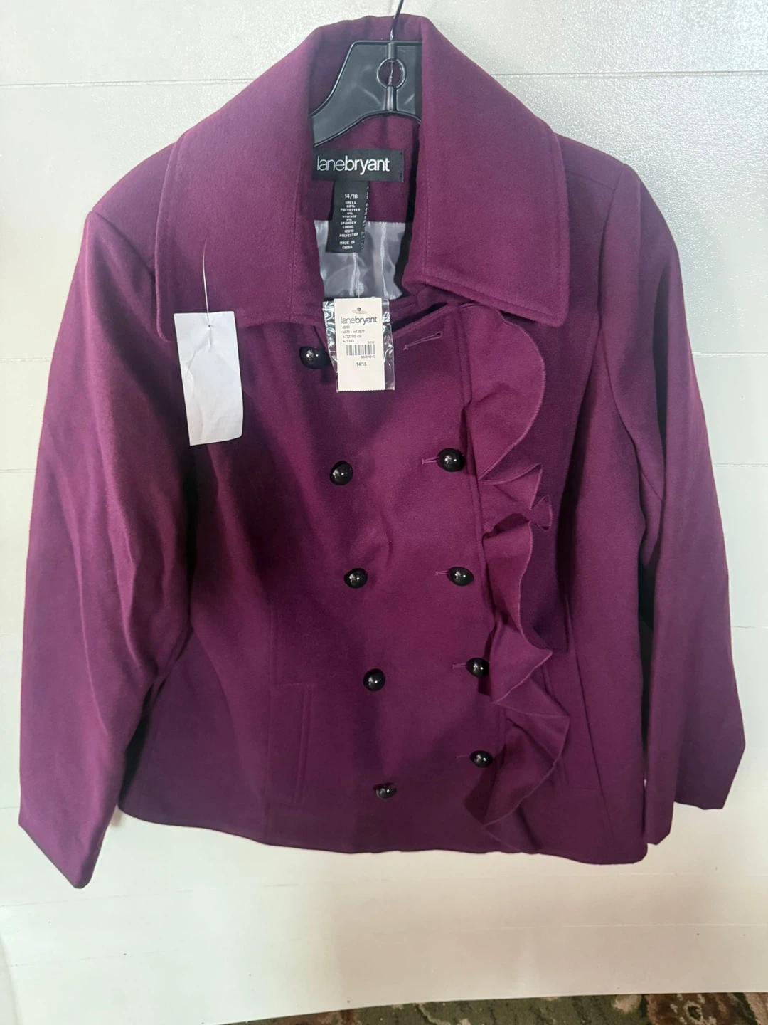 Here's a lovely Lane Bryant pea coat in a beautiful purple color! It features a stylish ruffle detail and is a size 14/16. Perfect for adding a pop of color to your wardrobe!