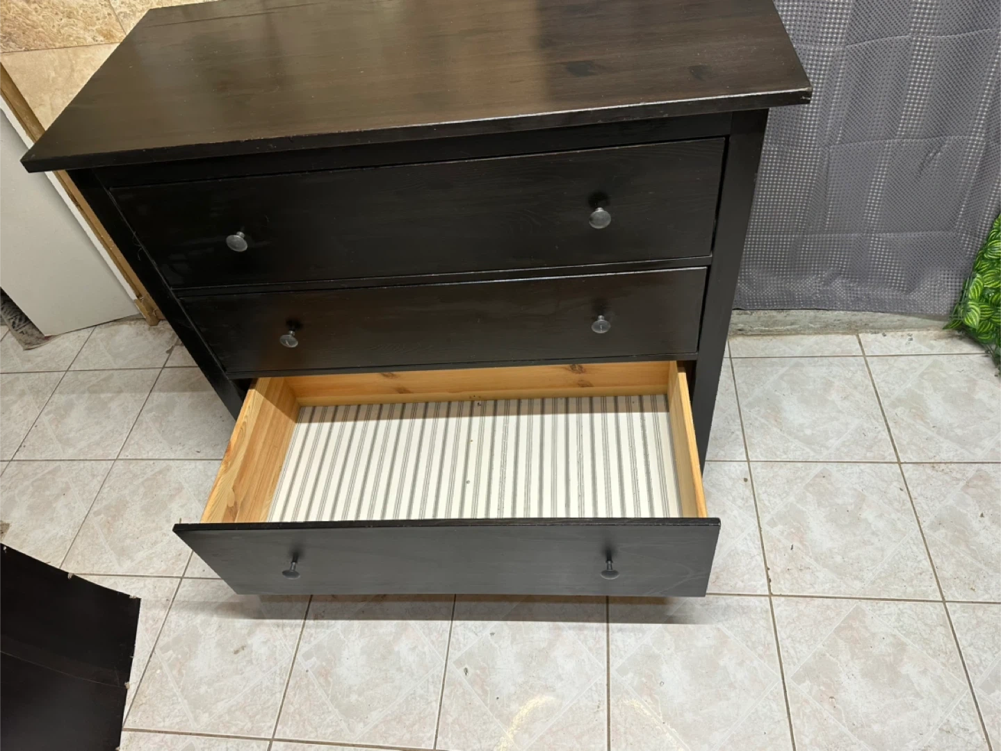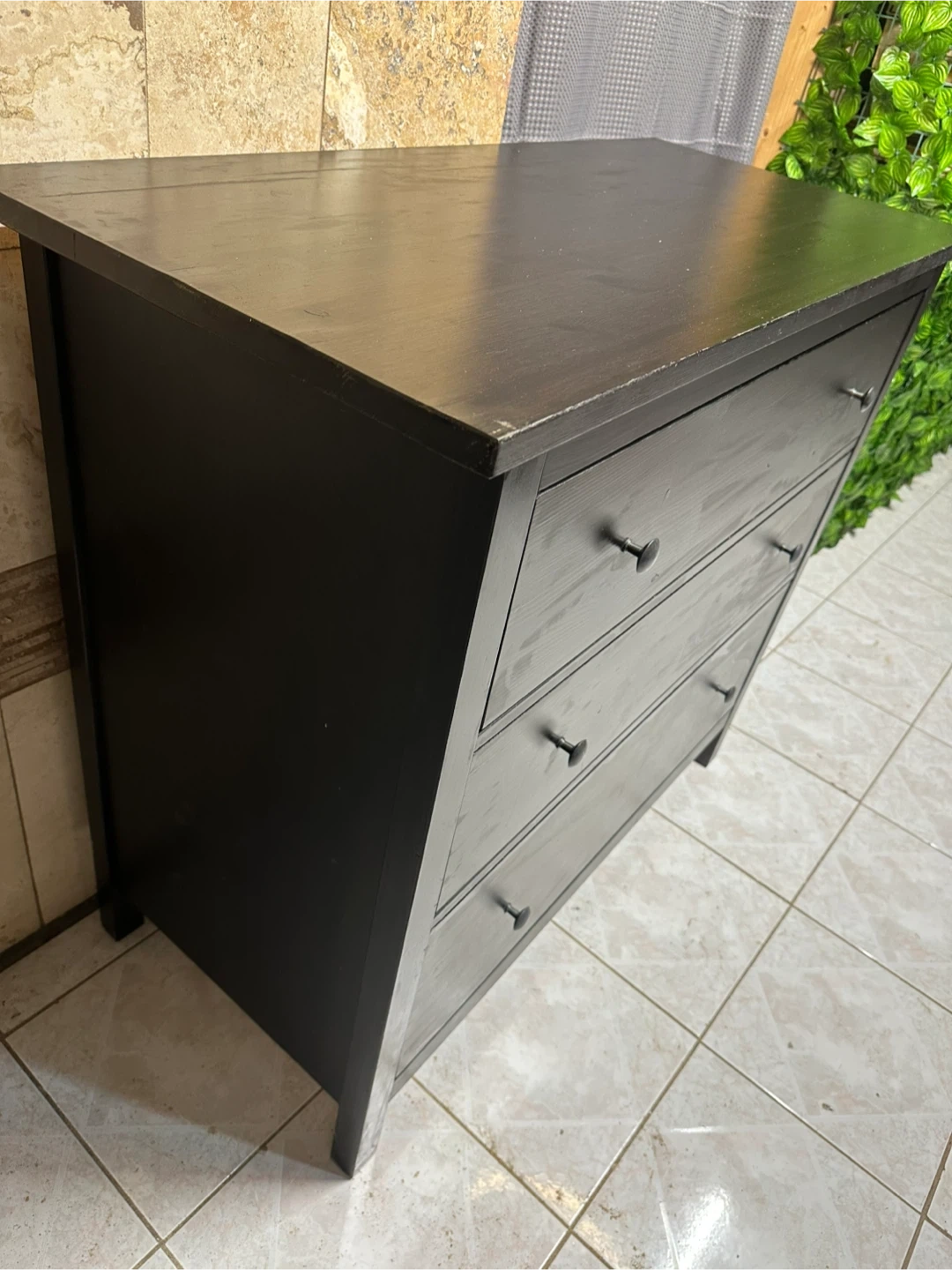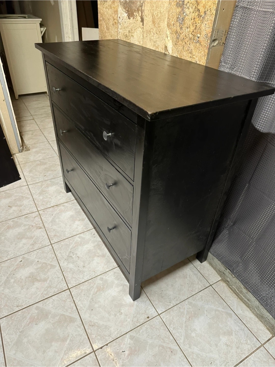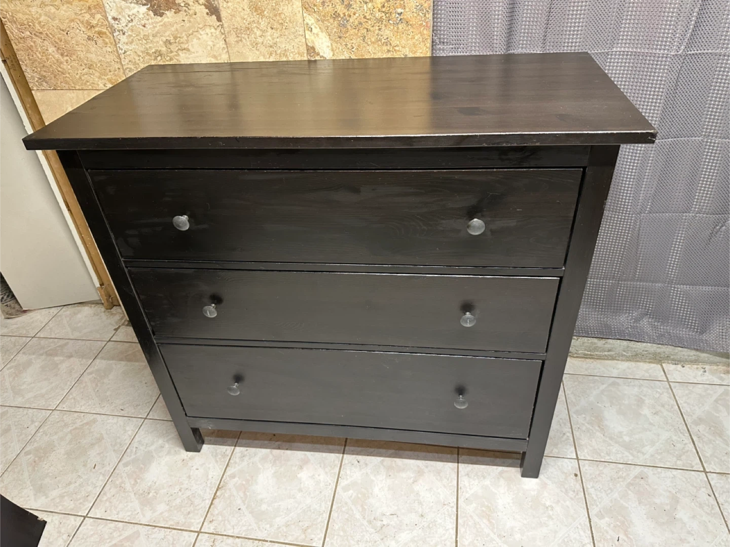 Here's a solid black real wood dresser with 3 drawers. It's a great piece for adding storage to any room.