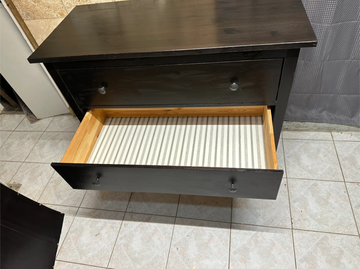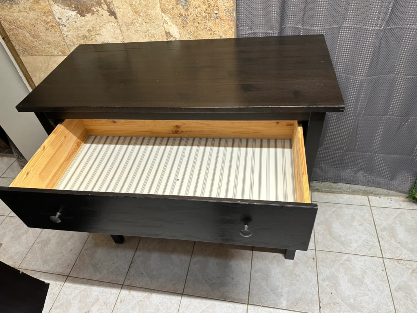 The inside of one drawer has a cute striped pattern.