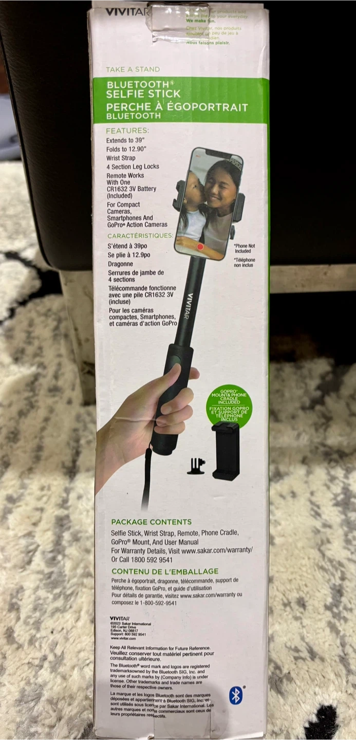 I'm selling a Vivitar Bluetooth selfie stick in like-new condition! It extends up to 39 inches and folds to 12.9 inches, making it super portable. It also features a 4-section leg design and a phone cradle. The package includes the selfie stick, wrist strap, remote, phone cradle, GoPro mount, and user manual. I bought this online for $15.98 and it's still in good shape! Complete with the box (like new)