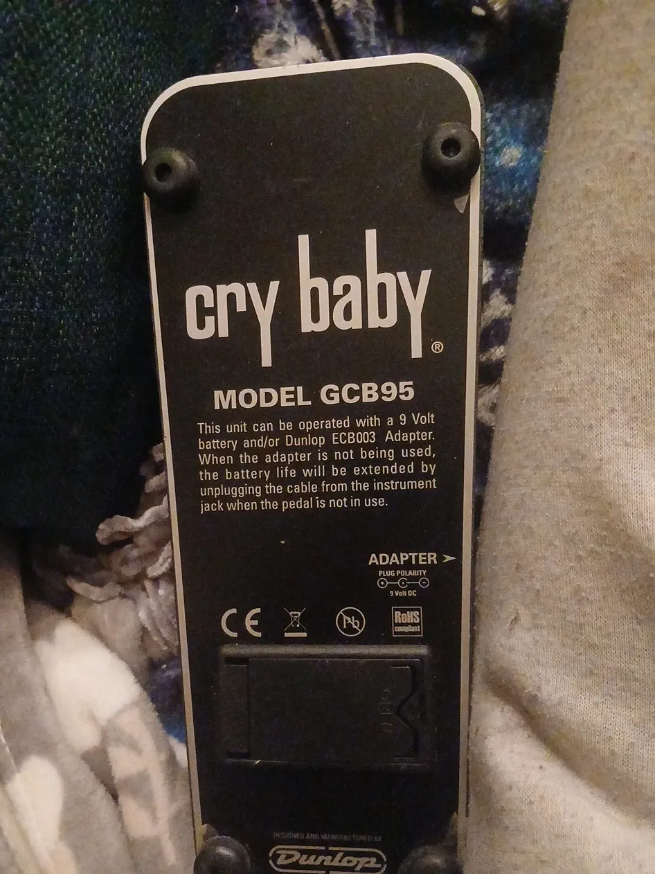 Selling a Dunlop Cry Baby wah pedal, model GCB95. This unit can be operated with a 9 Volt battery and/or Dunlop ECB003 Adapter. When the adapter is not being used, the battery life can be extended by unplugging the cable from the instrument jack when the pedal is not in use