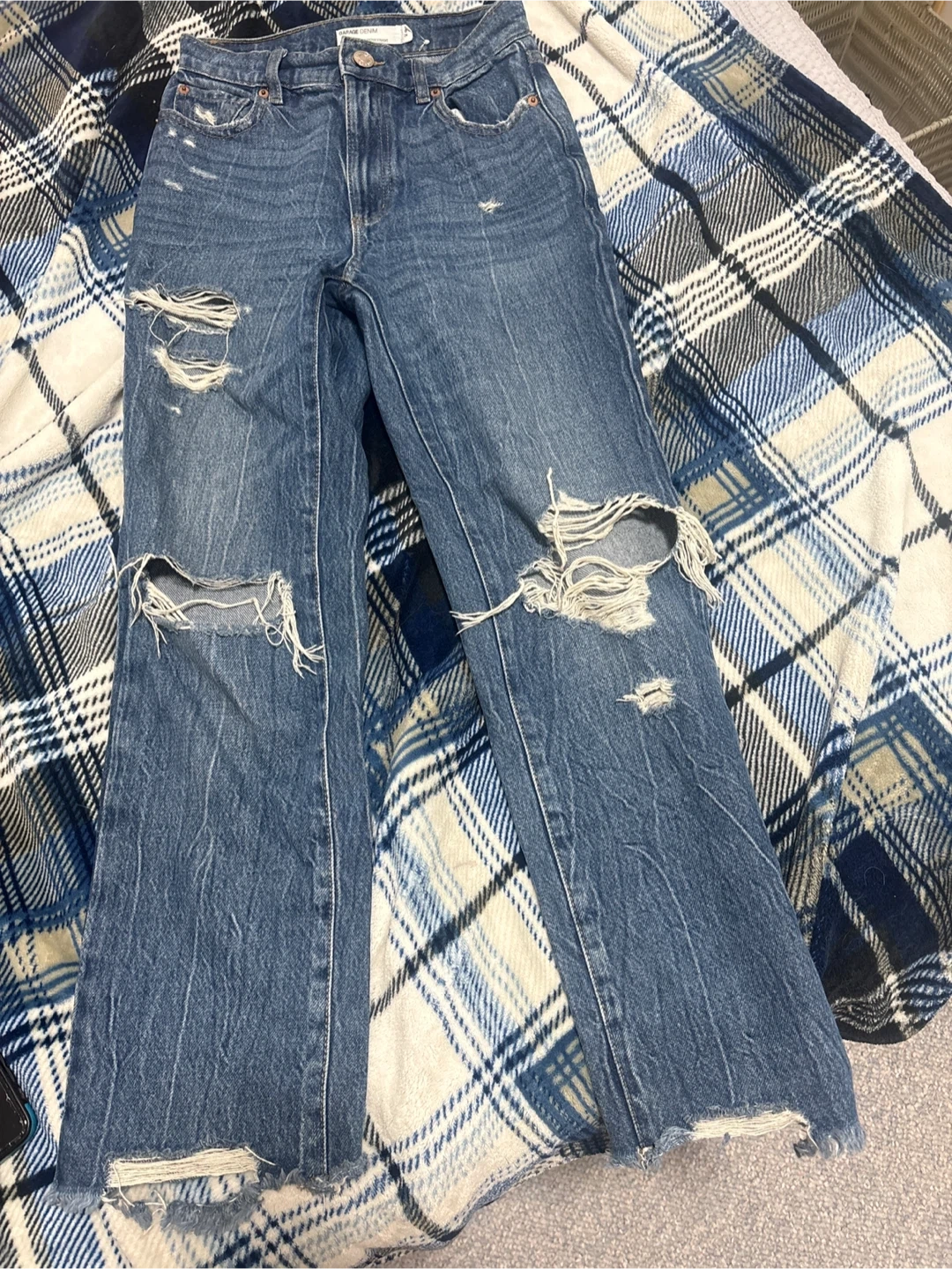 Selling a pair of Garage Denim vintage straight jeans. They are a size 24 and have a stylish, distressed look with rips and tears. Perfect for a casual, trendy outfit! Pick up cash only