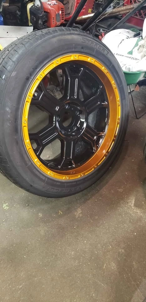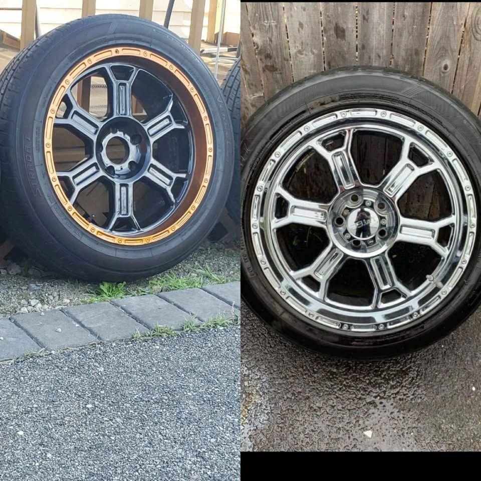 Offering customers with high quality rim refinishing. In the pictures seen I turned these typical chrome rims into glossy black rims with a burnt candied copper lip. Let me know what rim jobs you may have.