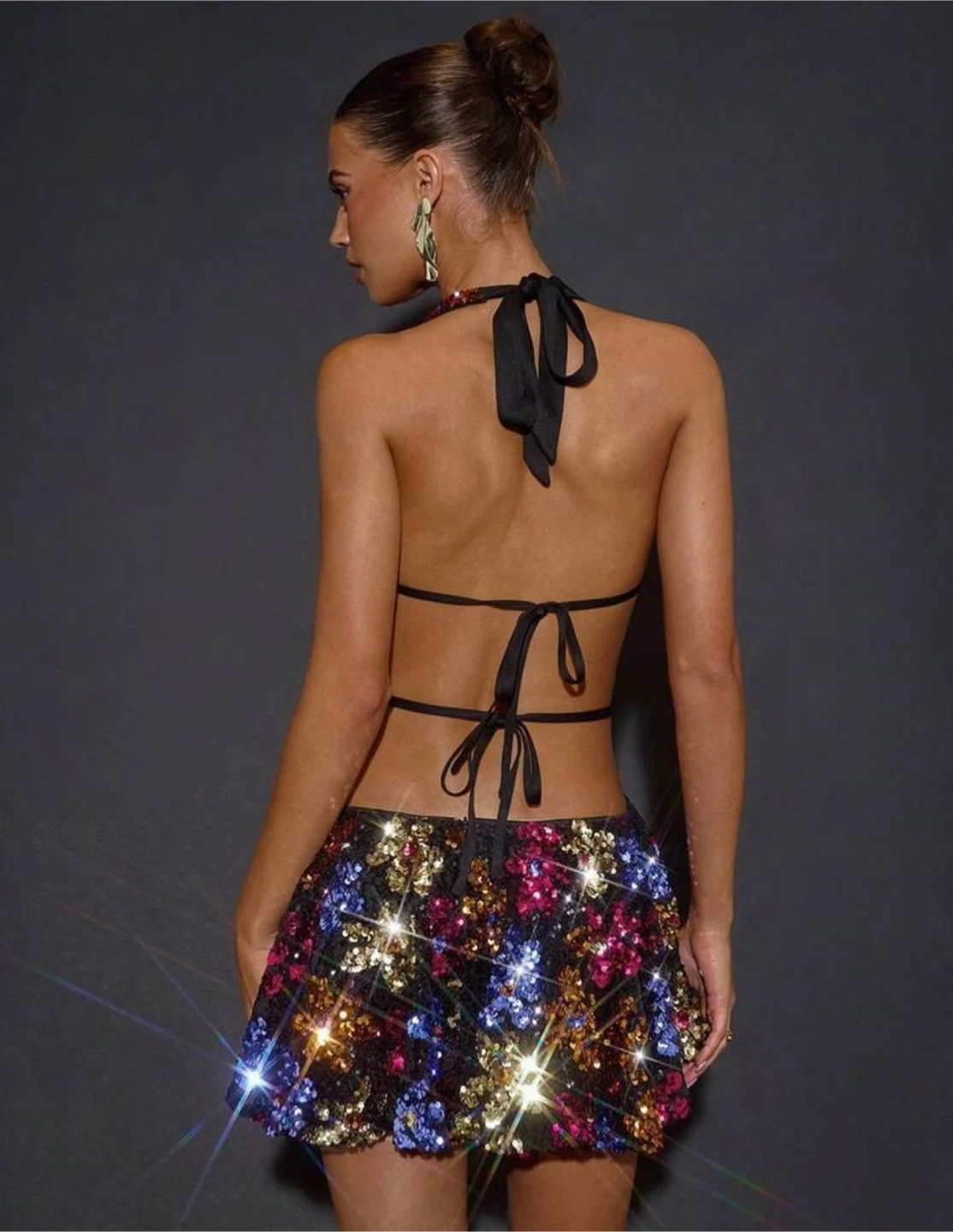 Stunning sequin halter mini dress with a vibrant multicolor design. Perfect for a night out.