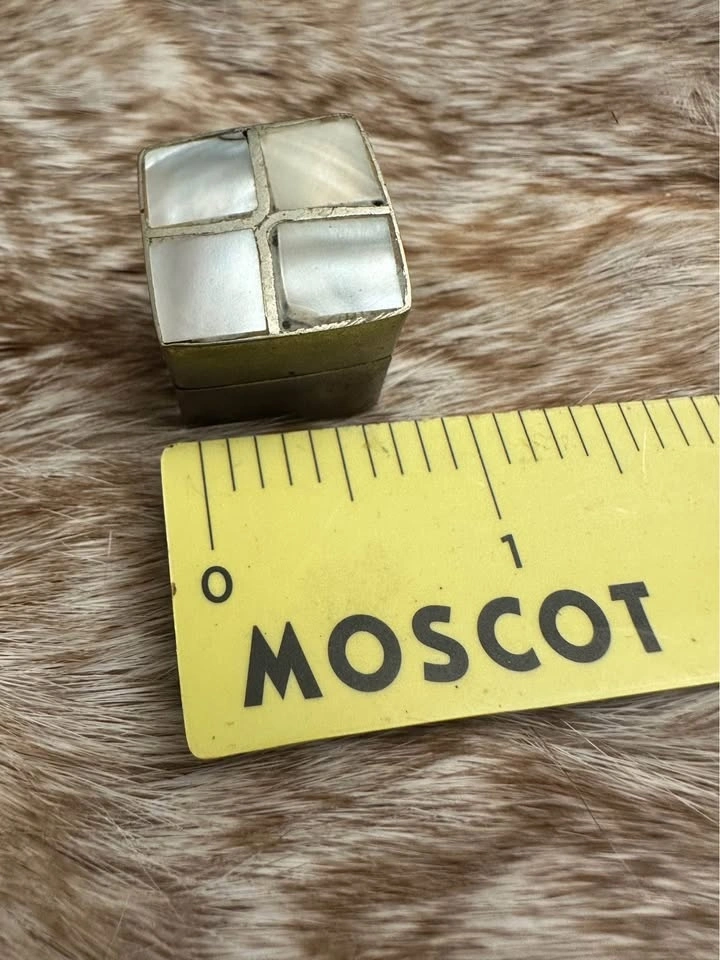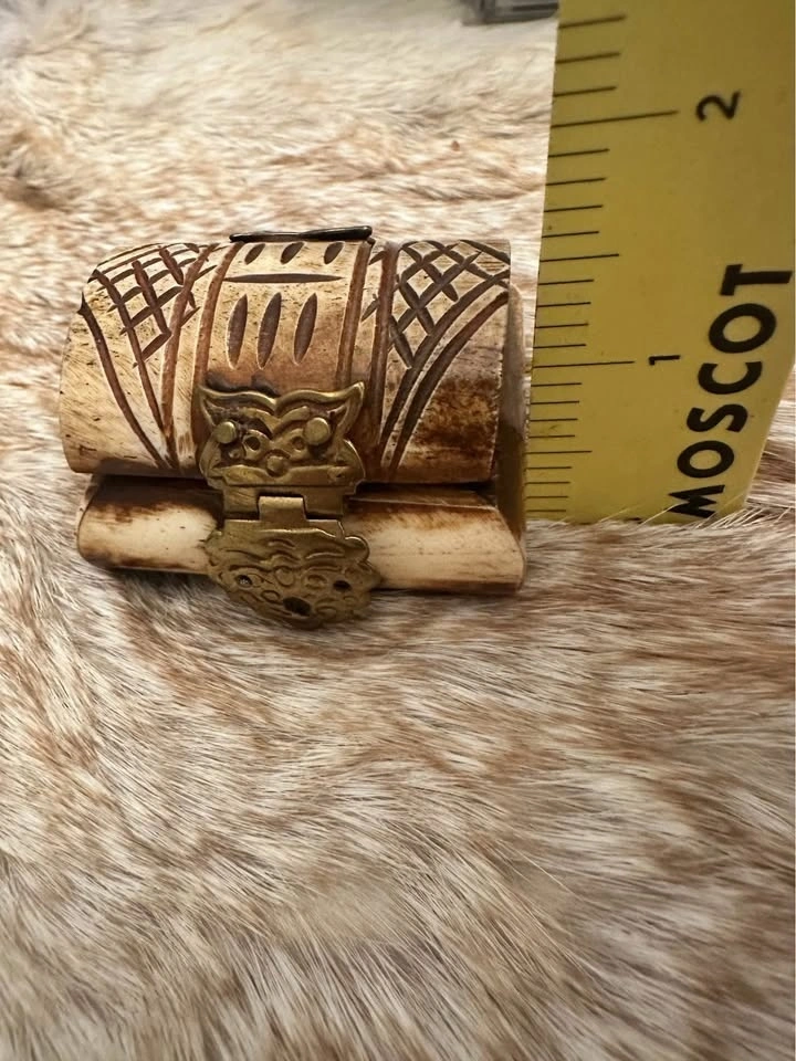This Vintage Camel Bone Brass Accents Hinged Lined Trinket Jewelry Box is a unique and stylish piece that perfectly encapsulates the mid 20th-century bohemian style. Handmade in India, this trinket box features a solid rectangular shape with intricate brass accents and a natural finish. The multicolor design adds a touch of charm, making it a perfect addition to any collection or decor. The hinged lid and lined interior ensure that your keepsakes are safe and secure, while the medium size makes it versatile for all occasions. Display this original piece in any room for a touch of vintage flair.