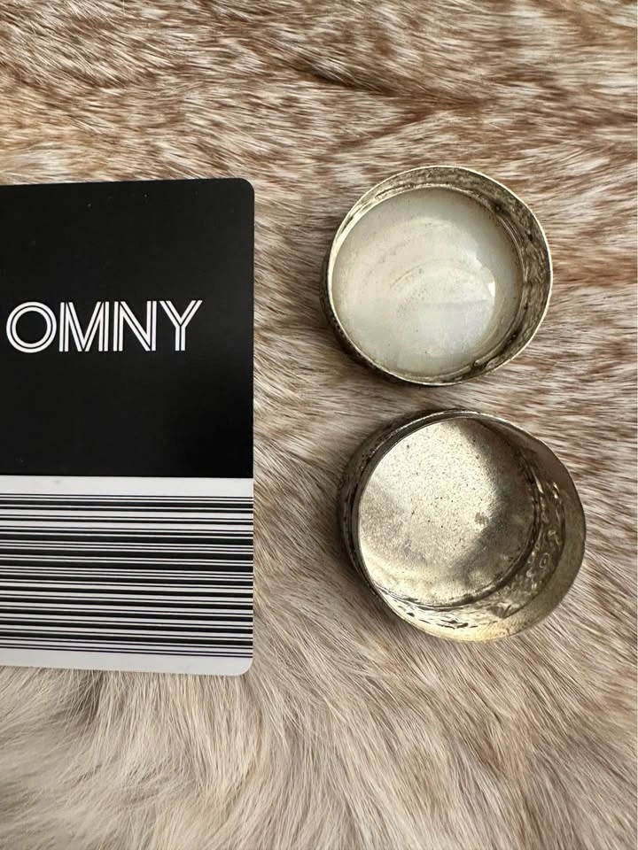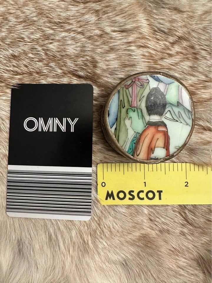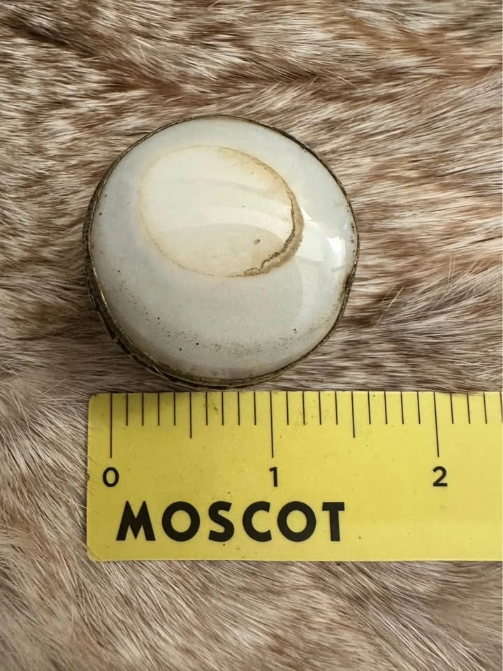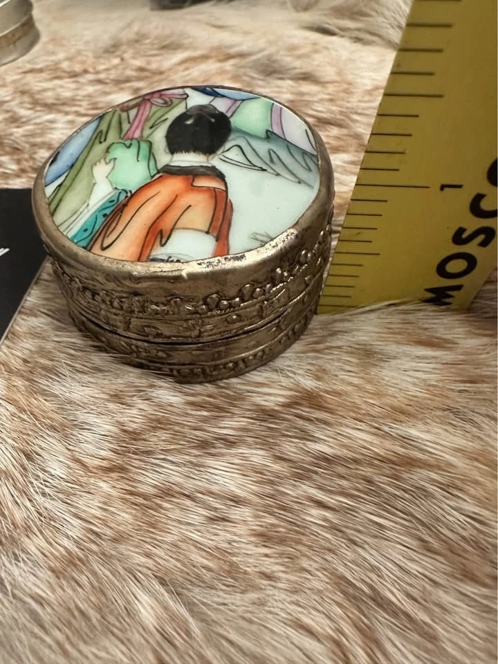 Vintage; Great w/ normal signs of age, tarnish and minor denting to metal surface on the exterior and interior. The marble lid features artwork and shows minor to normal signs of age.
