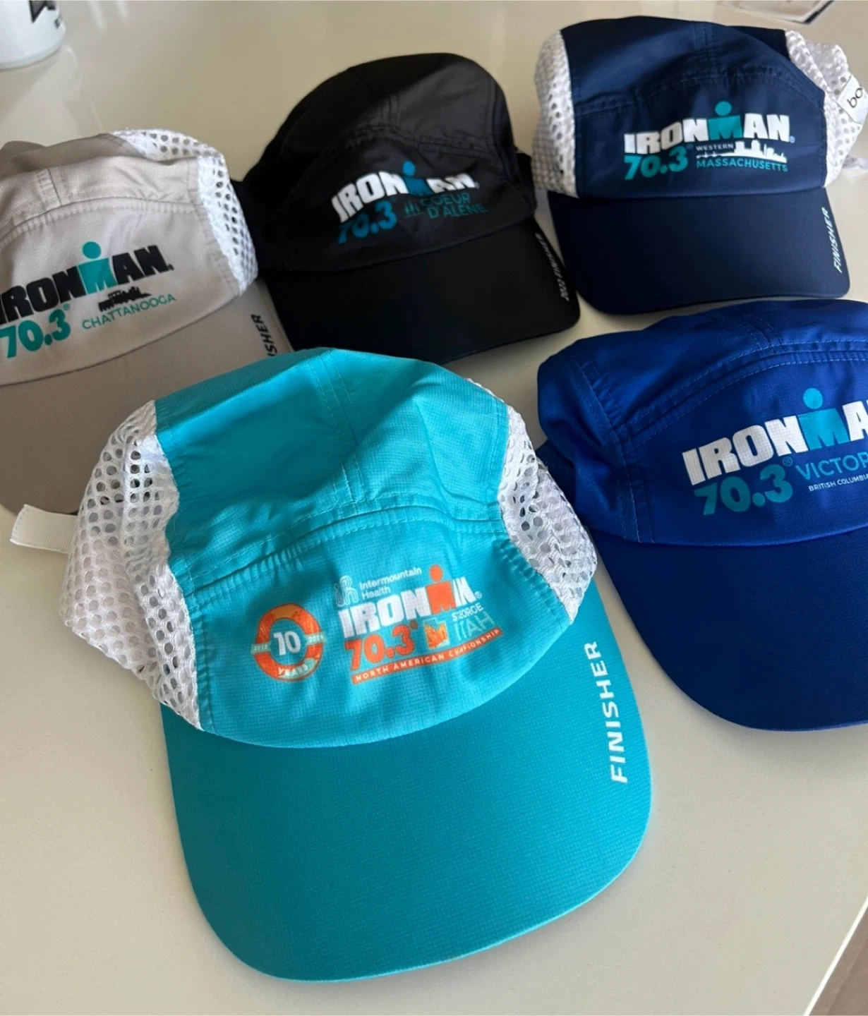 Selling a collection of Ironman 70.3 finisher hats! There are several different locations represented, including Chattanooga, Coeur d'Alene, Western Massachusetts, and British Columbia. Brand new!
