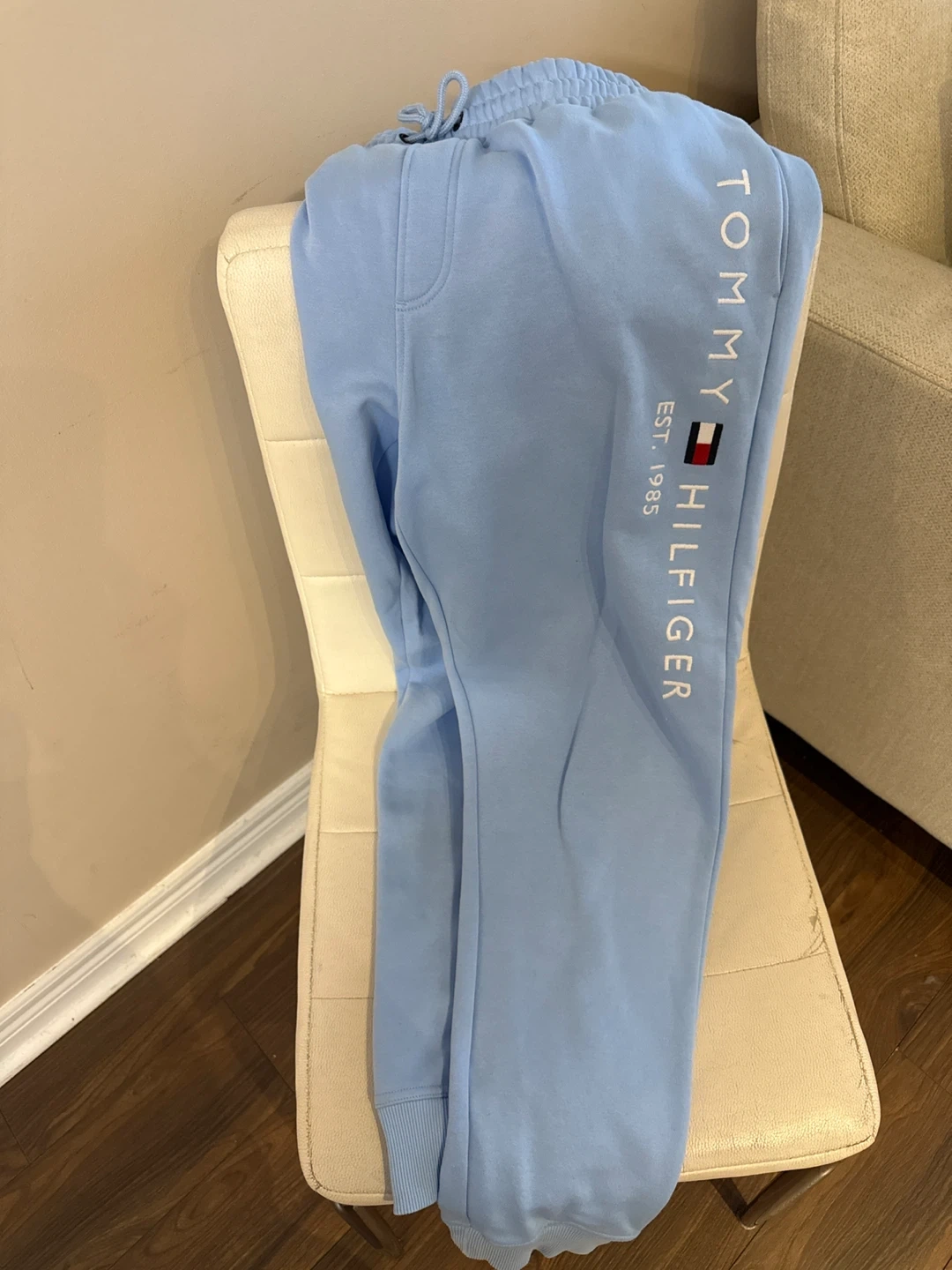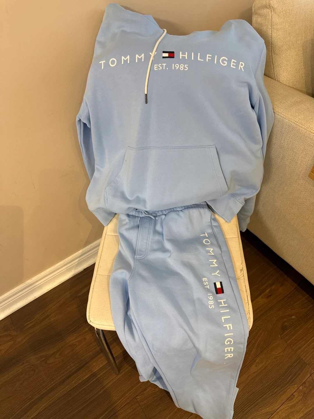 Selling a comfy Tommy Hilfiger set! It includes a light blue hoodie and matching sweatpants. Both pieces feature the Tommy Hilfiger logo. Great for lounging or casual outings!
