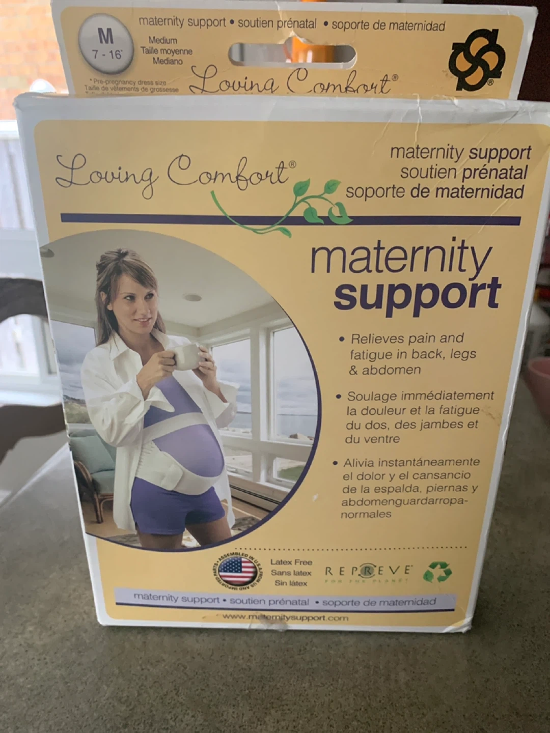 Selling a Loving Comfort maternity support belt in size medium. It's designed to relieve pain and fatigue in your back, legs, and abdomen during pregnancy. The box is included! New $100 Amazon $25