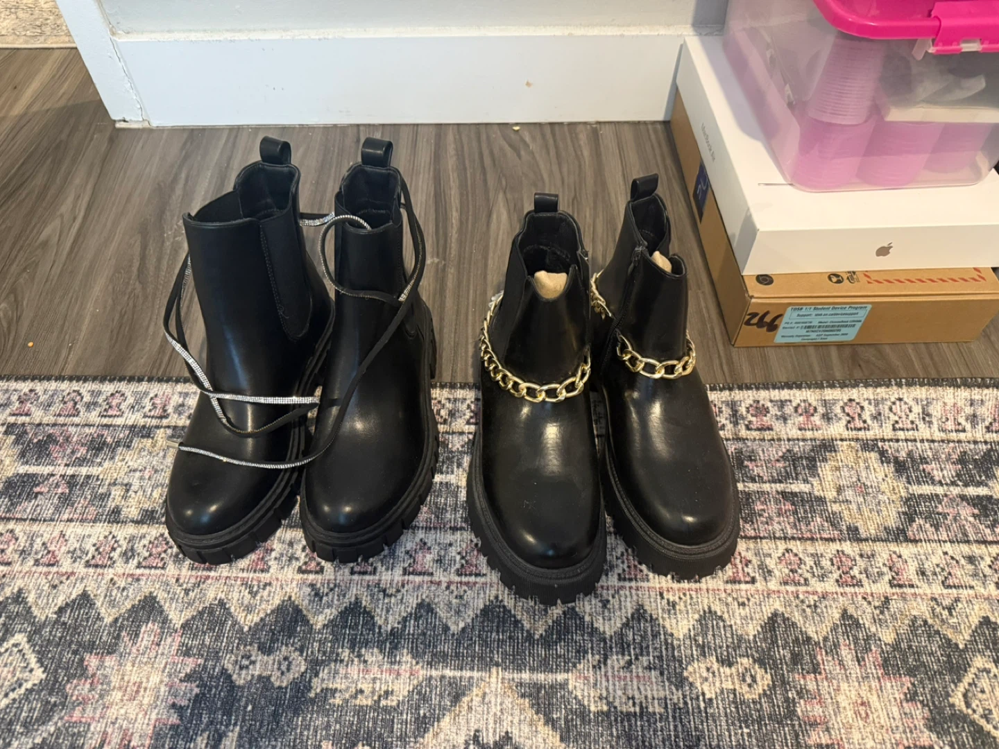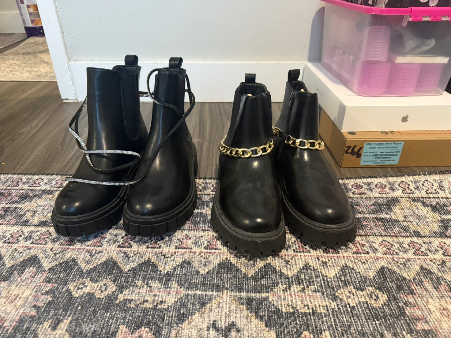 Selling two pairs of black Chelsea boots! One pair has a silver chain detail, and the other features a gold chain. Both are in great condition and are a size 8. Perfect for adding a bit of edge to your outfit!