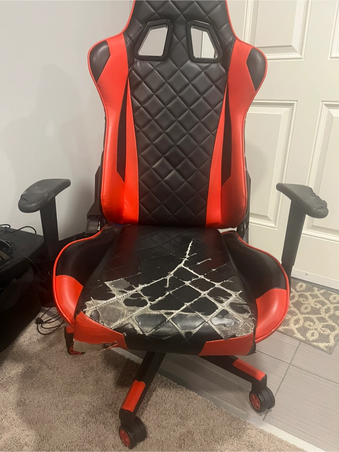 Selling a gaming chair that's seen better days. As you can see, the seat has some significant wear and tear. It's red and black. Still functions as a chair though!