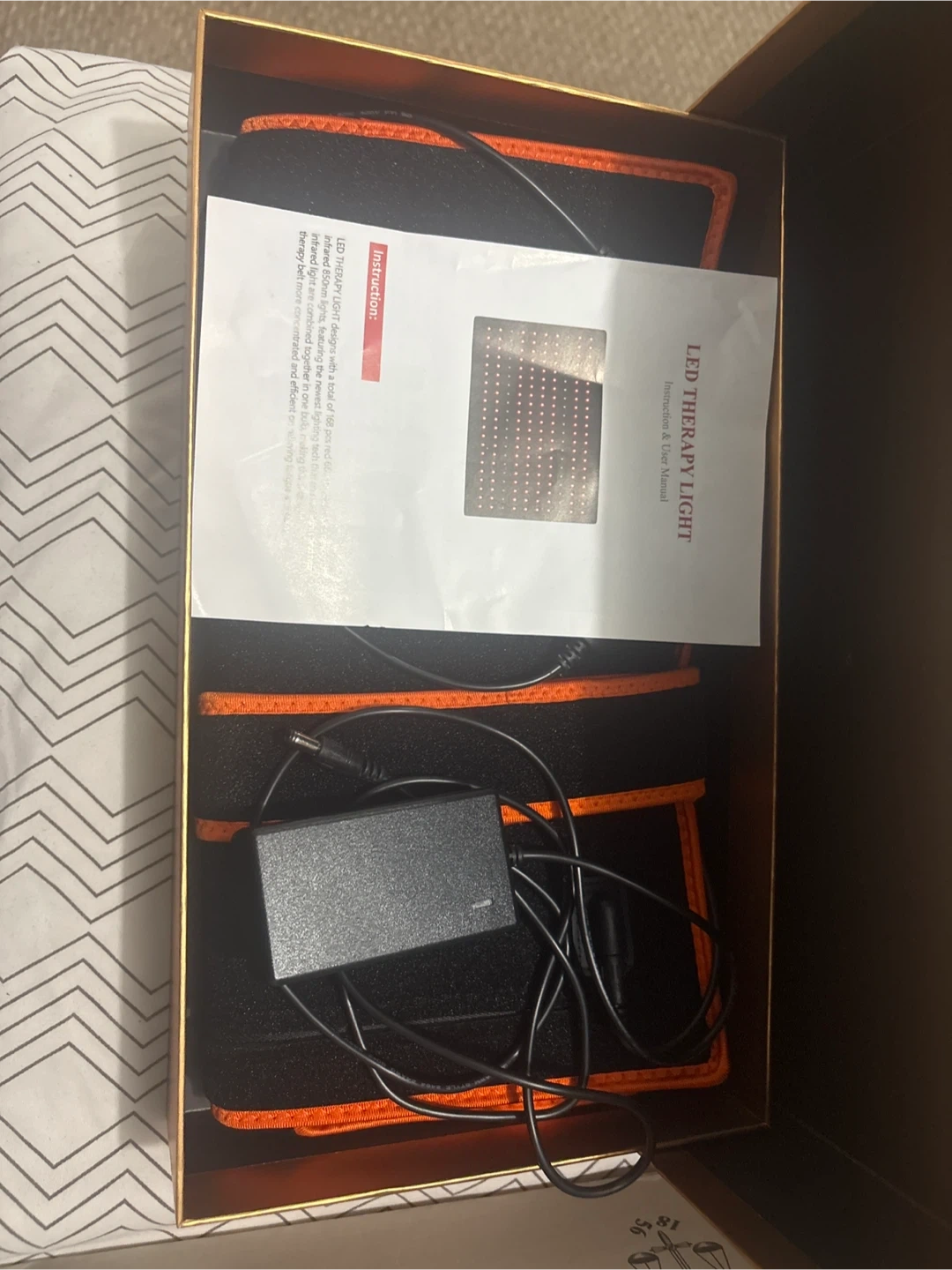 I'm selling an LED Therapy Light, complete with its instruction manual and user manual. It features 168 red and infrared 850nm lights. The newest lighting tech combines red and infrared light, making the therapy belt more concentrated and efficient. The box is included!