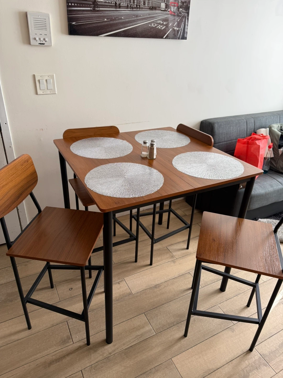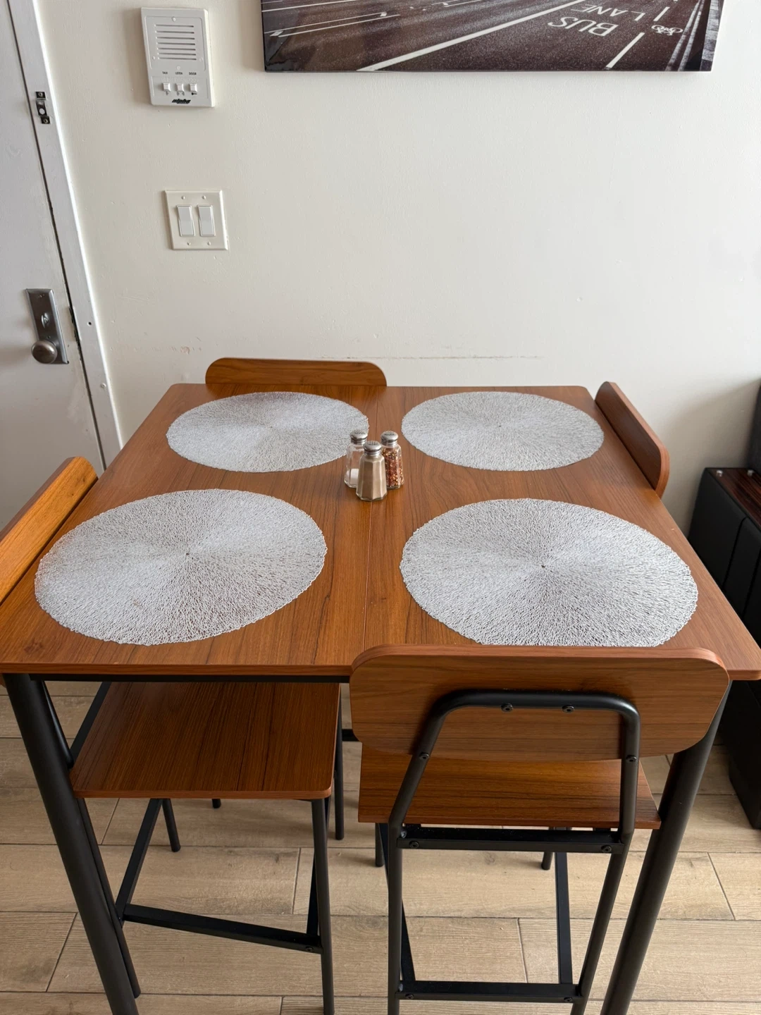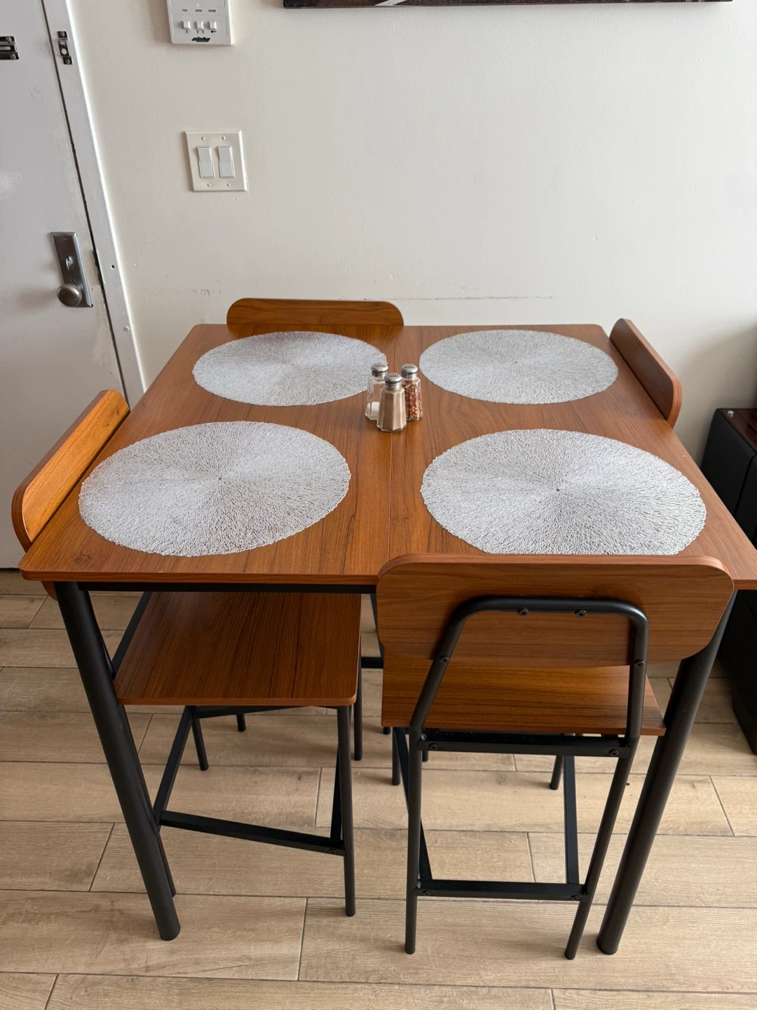 Selling a dining table set that includes four chairs. The table and chairs have a wood-look finish with black metal frames. This set would be perfect for a small dining area or apartment
