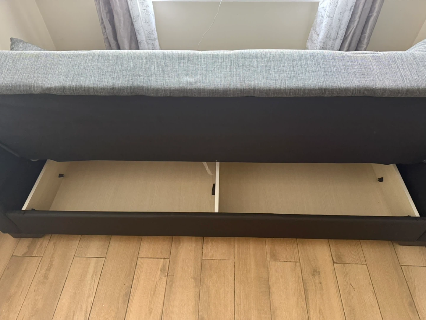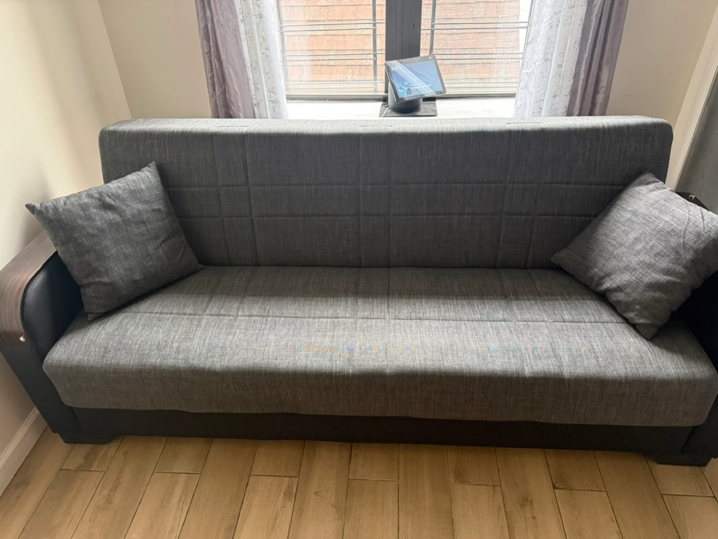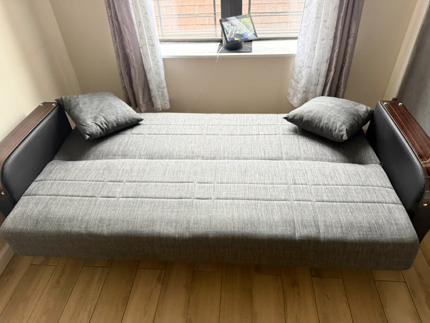 Selling a gray sofa bed. It comes with storage underneath the seating area, perfect for keeping blankets or other items. It also includes two matching cushions. The sofa bed is in good condition and ready for a new home!