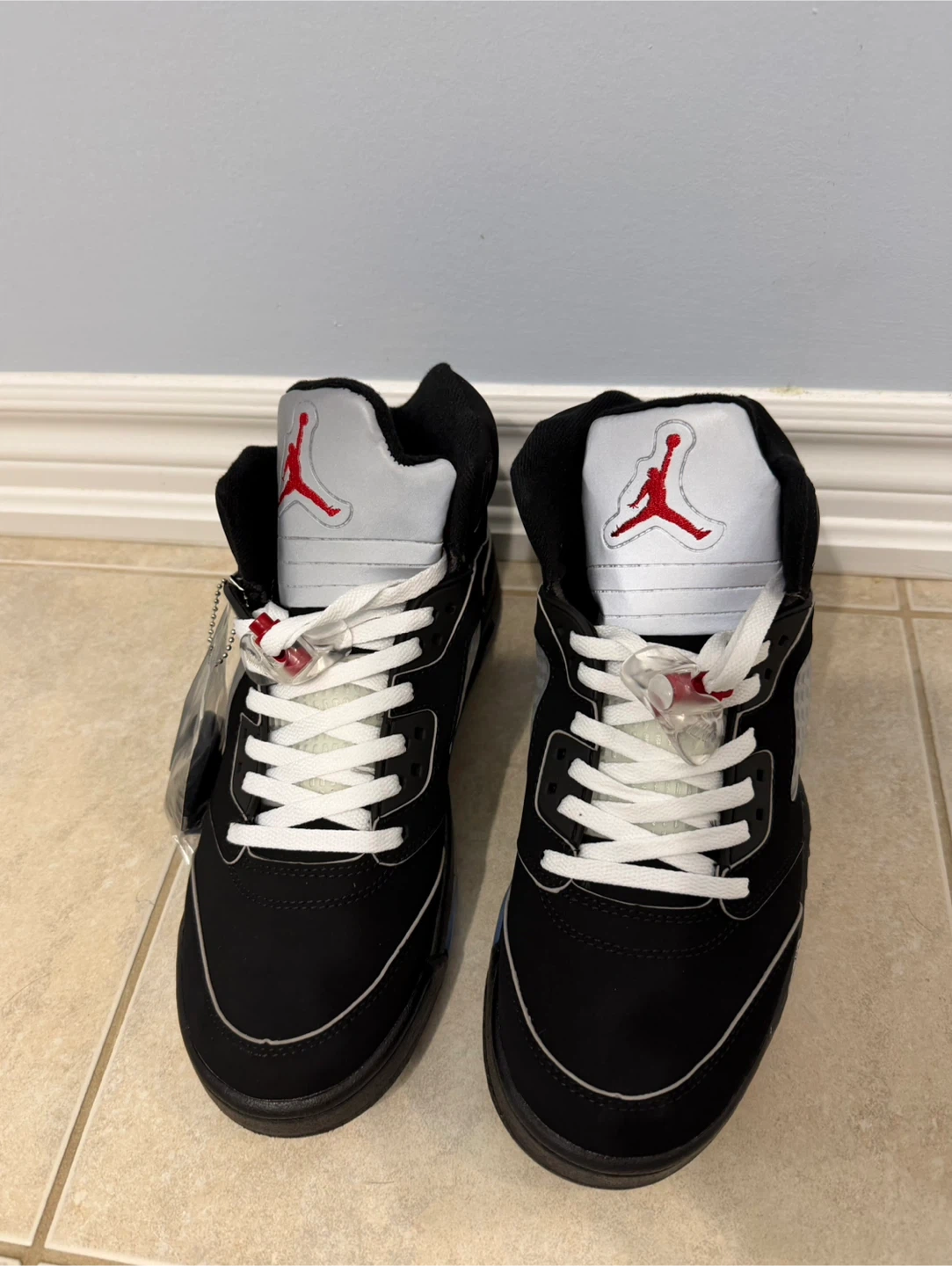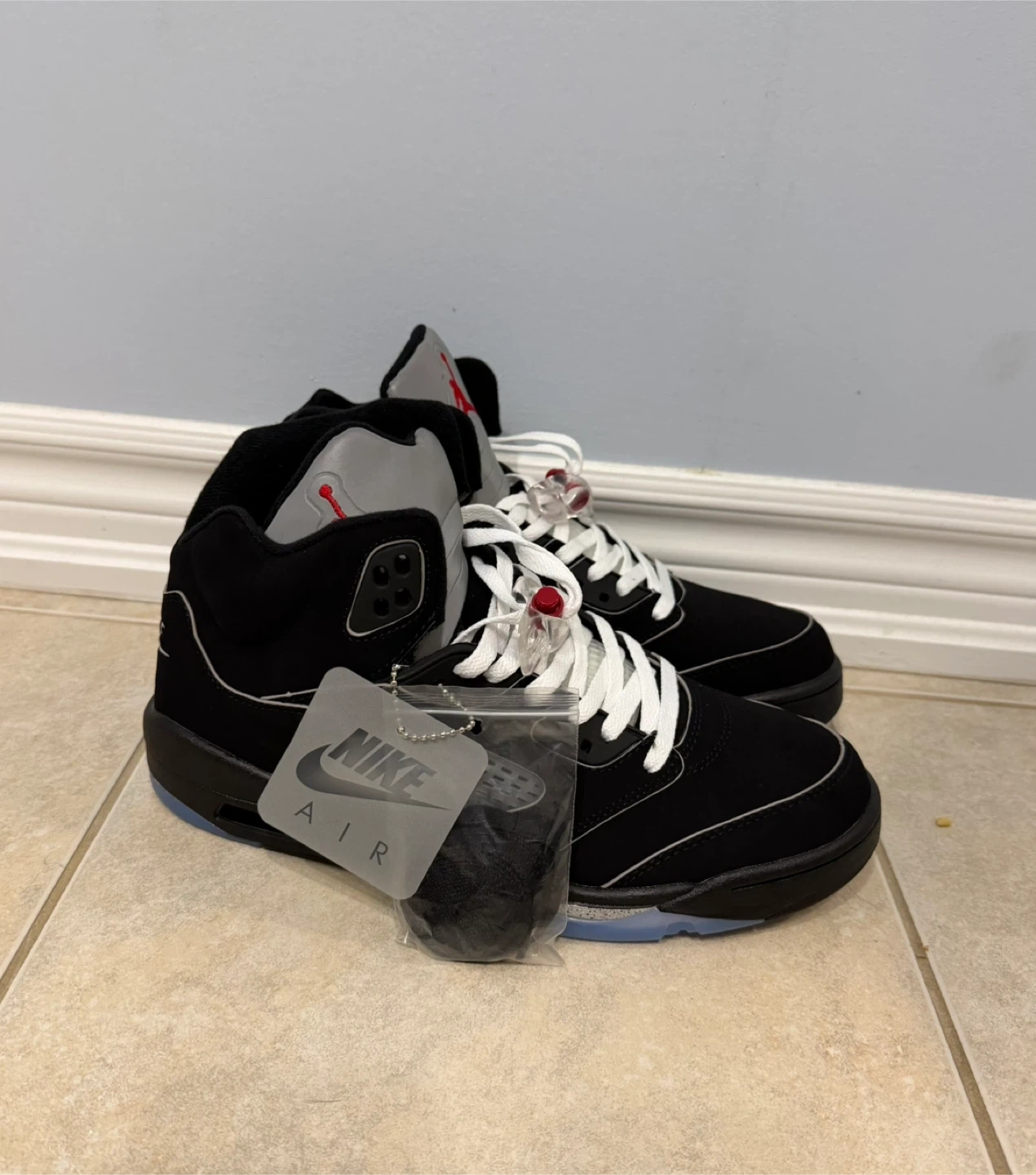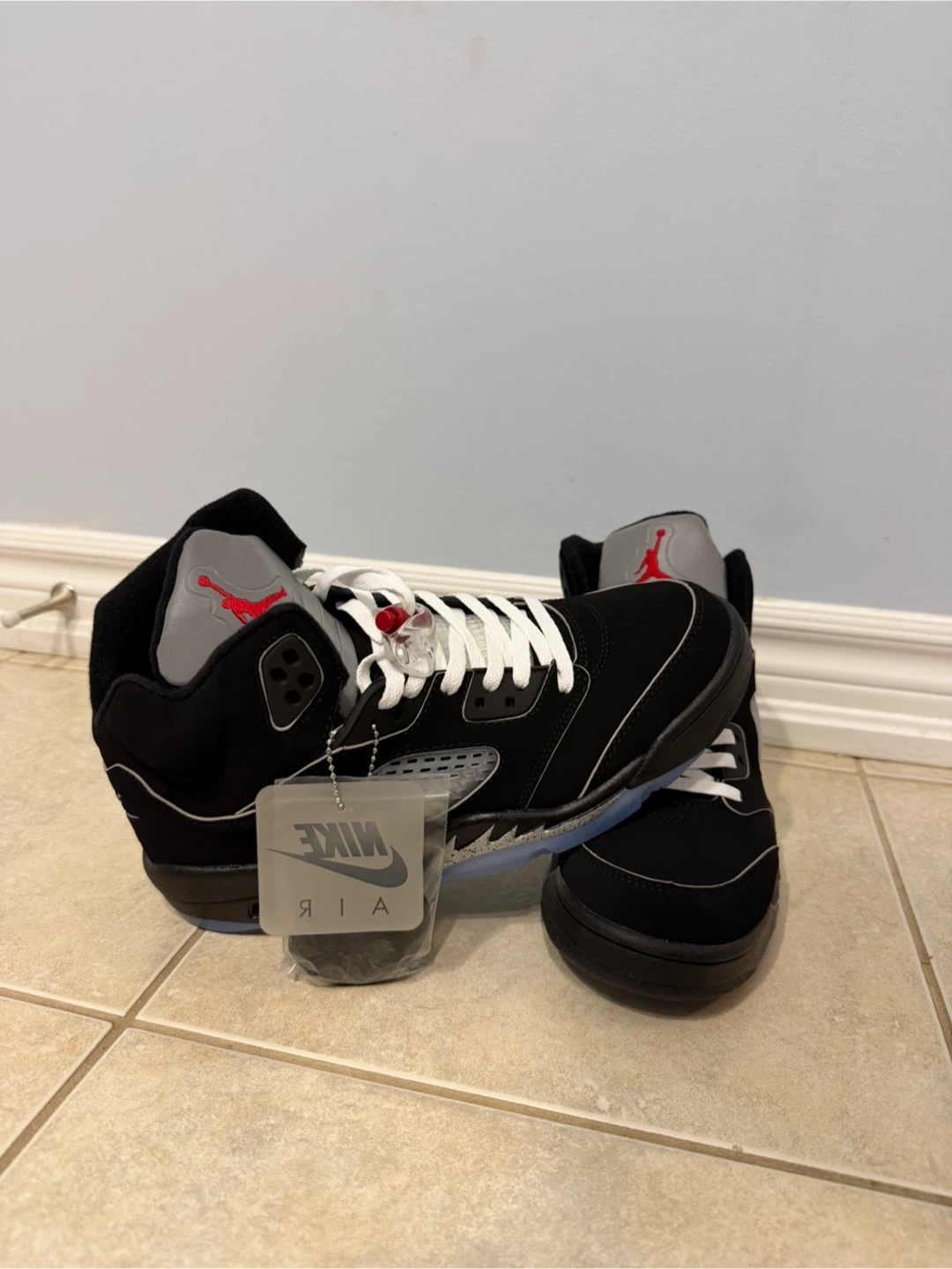 Selling a pair of Nike Air Jordan 5 Retro sneakers in black and university red. They're in great condition and ready for a new owner!