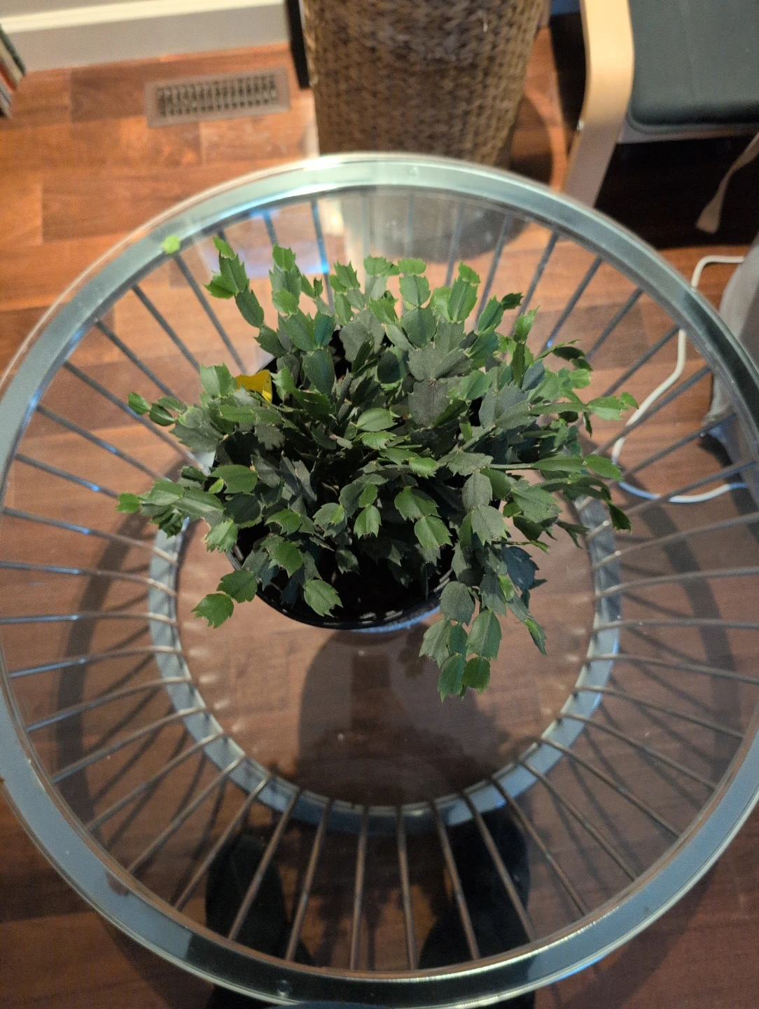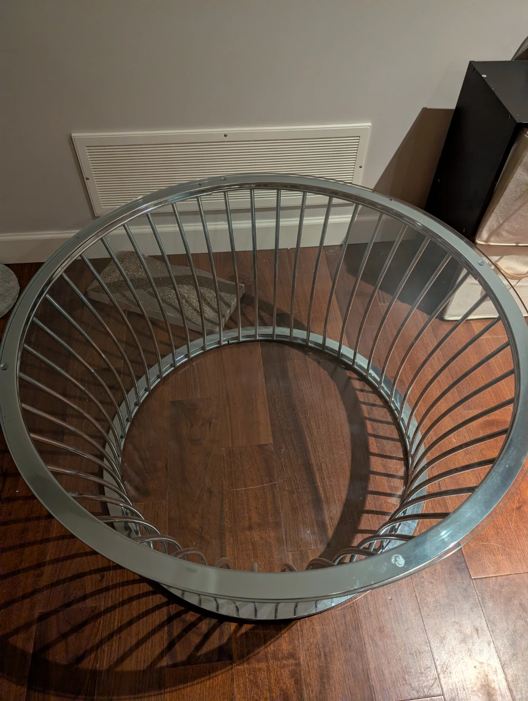 Selling a round coffee table with a glass top and a chrome frame. It's in good condition and would be a stylish addition to any living room!
