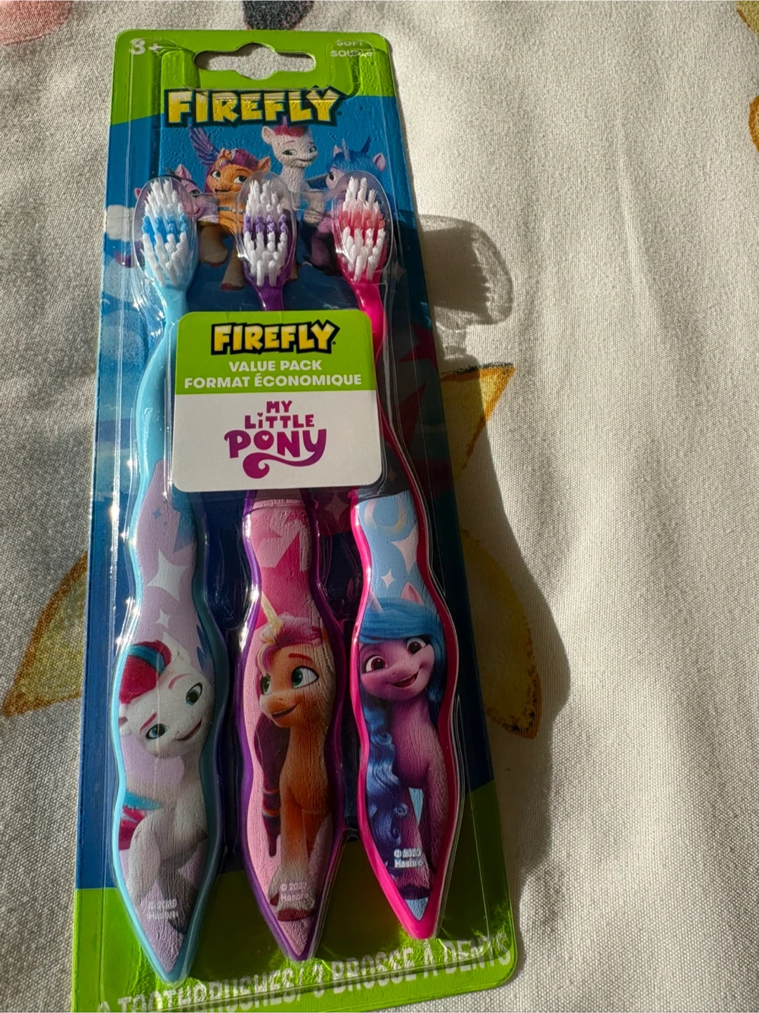 Selling a brand new 3-pack of Firefly My Little Pony toothbrushes! Perfect for kids aged 2 and up. They have soft bristles and fun ergonomic handles to help make brushing enjoyable for little ones. Great for encouraging healthy habits!