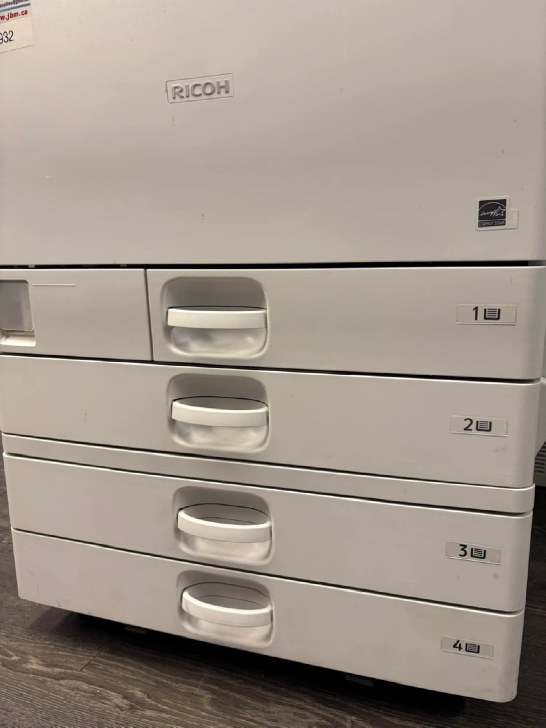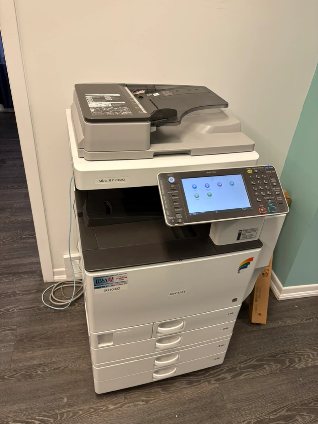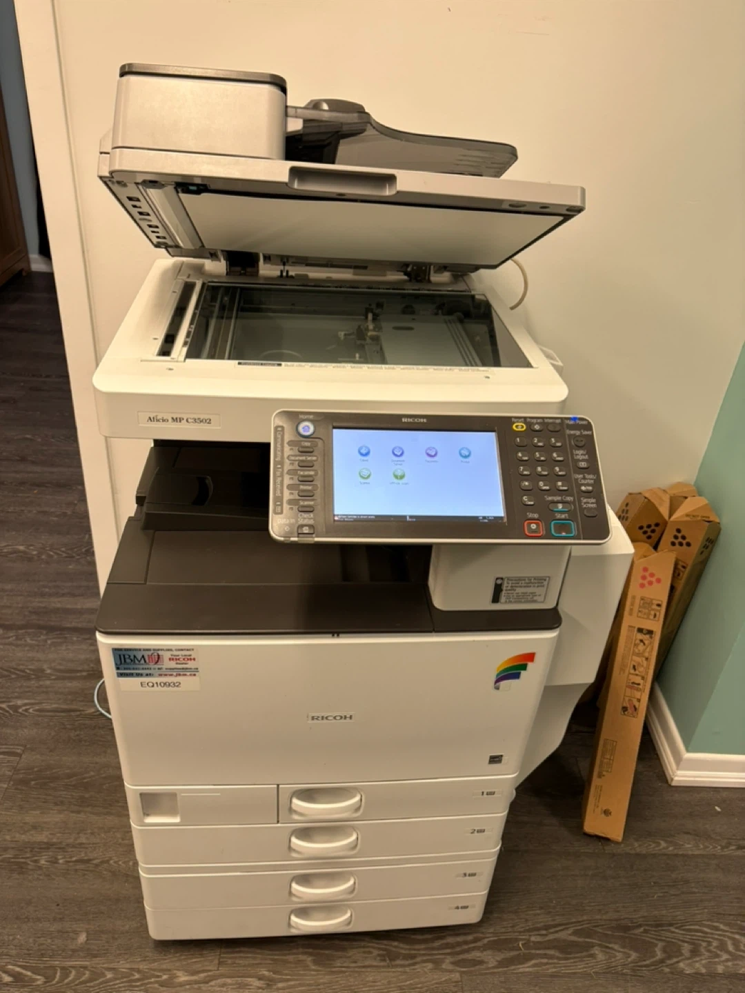 RICOH Aficio MP C3502 COLOUR PHOTOCOPIER with scanner and facsimile. Print via wi-fi; 2 letter trays, 1 legal tray, 1 11” x 16” tray. Includes 3 new toner cartridges