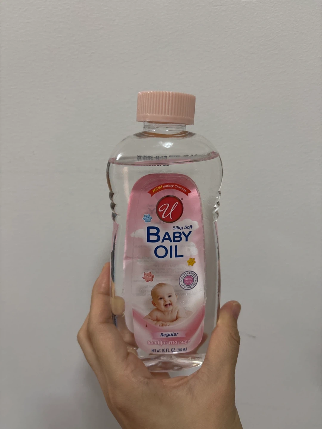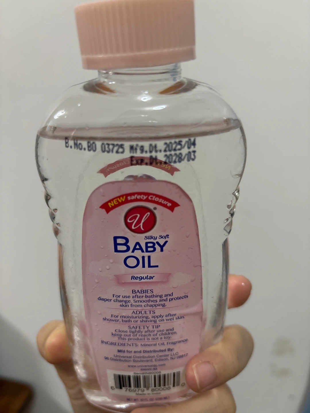 Free a bottle of Universal Baby Oil, Regular size, 10 fl oz (296 ml). It's a silky soft oil perfect for use after bathing, showering, or shaving. It helps moisturize and protect skin from chapping. The expiration date is 2028 March 03.