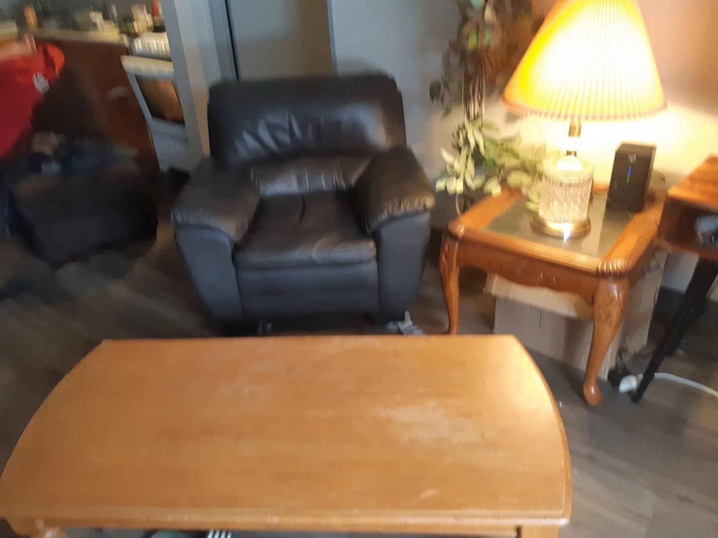 I am selling leather chair coffee table end table lamp fake tree and glass TV stand I am moving out of the province and I'm selling this for a great low price of $200 or reasonable offer hurry before it's gone