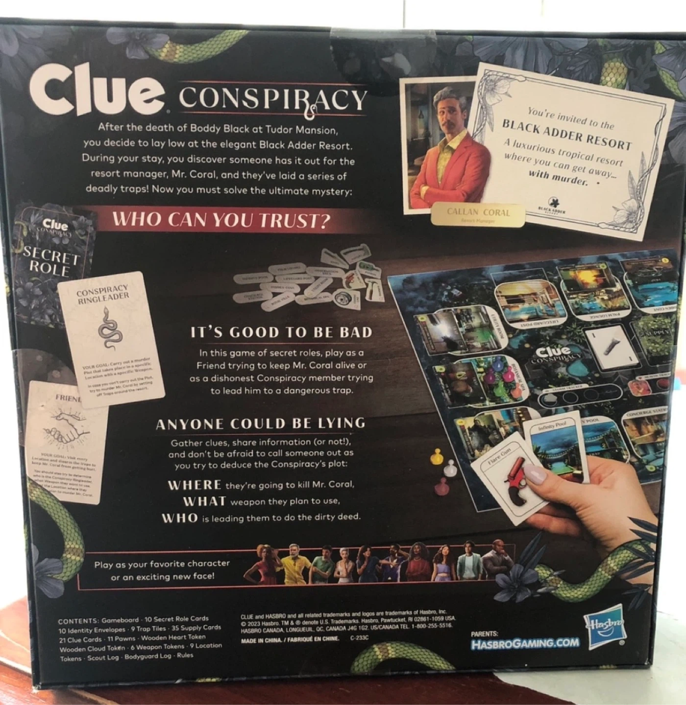 Selling a Clue Conspiracy board game in new condition ! It's a secret role game of shifting suspicions where you lie to your friends and get away with murder. Perfect for 4-10 players, ages 14 and up. Enjoy playing your favourite character or an exciting new face!
