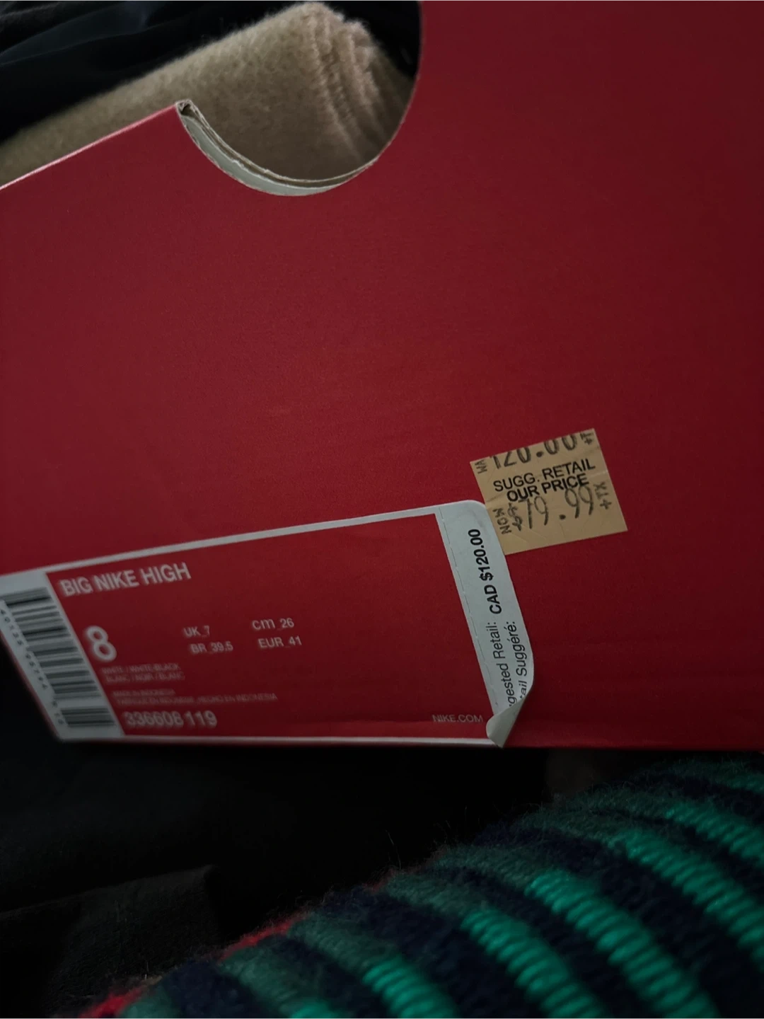 Buy & SellNike Big Nike High - Size 8Nike Big Nike High - Size 8$81Selling a pair of Nike Big Nike High shoes in size 8. They are white and in great condition! The box is included. Originally retailed for $120 CAD.ConditionNewSize8BrandNikeWHERE TO MEETCheck LocationView MapSELLERverifiedValCentral London740 reviews0 chats·0 favorites·6 viewsSEND CHAT TO SELLERHi Val! I’m interested in your listing.Hi Val! I’m interested in your listing.Get the Karrot app to chatSign In to chat