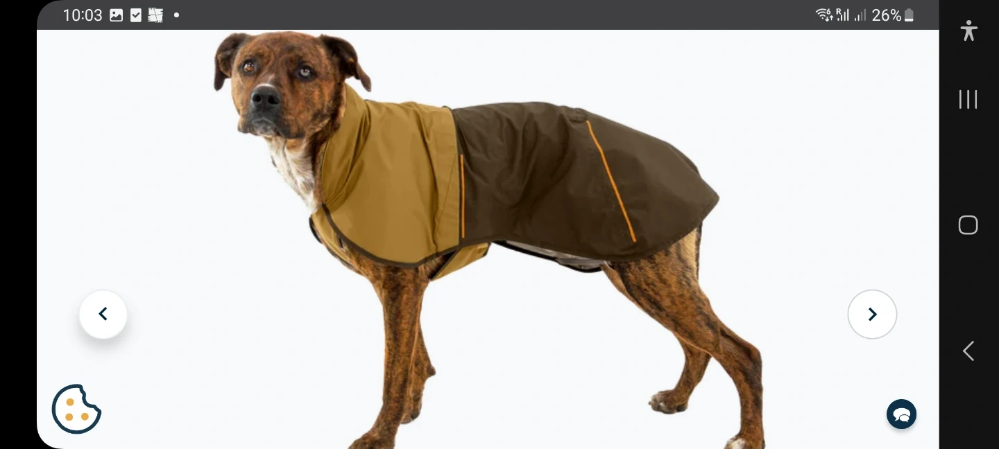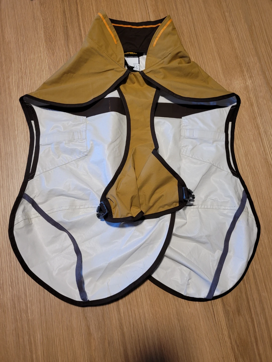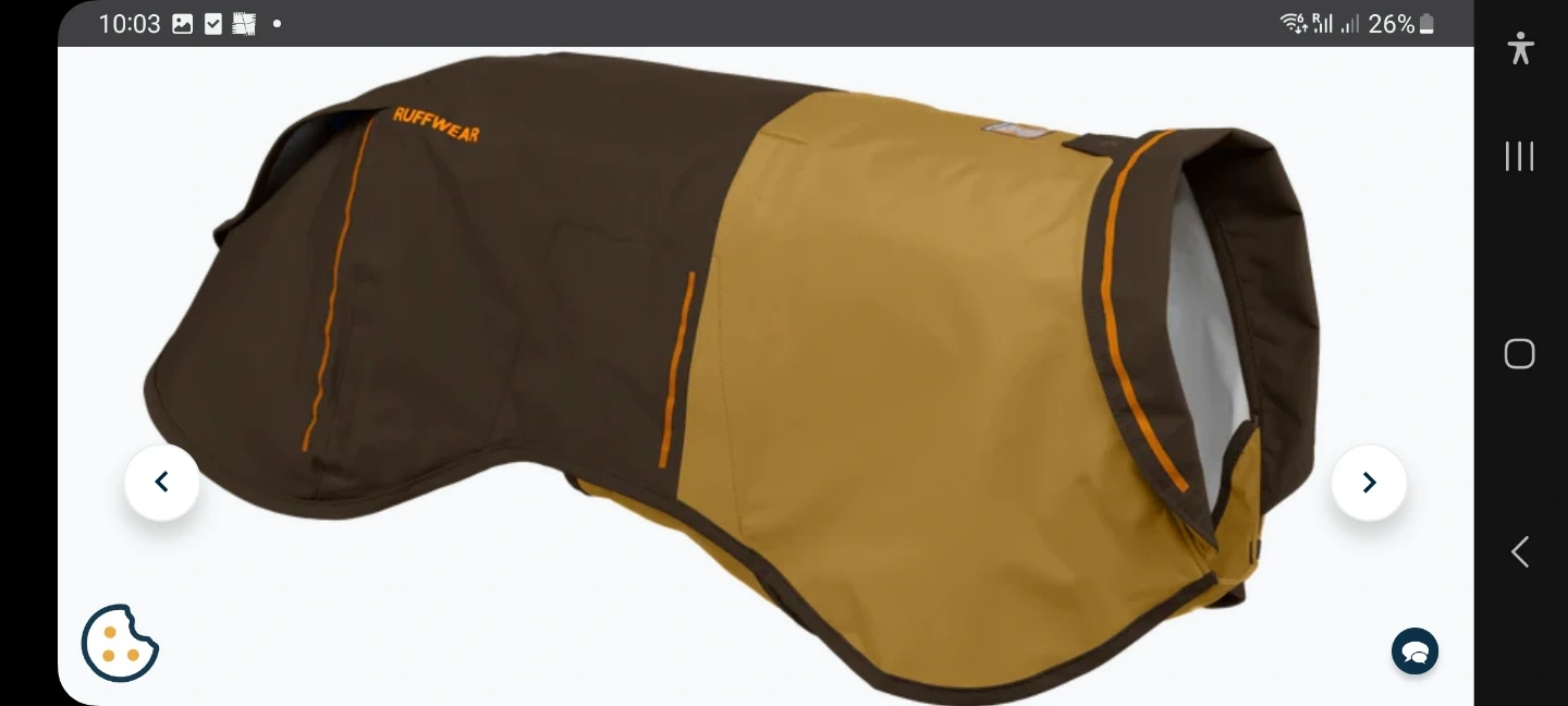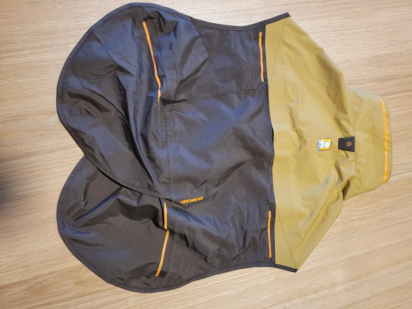 Selling Ruffwear Sun Shower Dog RainCoat ! It's in perfect condition (used just a couple of times) and size small. The coat is brown. It fits dogs with a girth of 22-27 inches (56-69 cm) and a back length of 18-24.5 inches (46-62 cm).