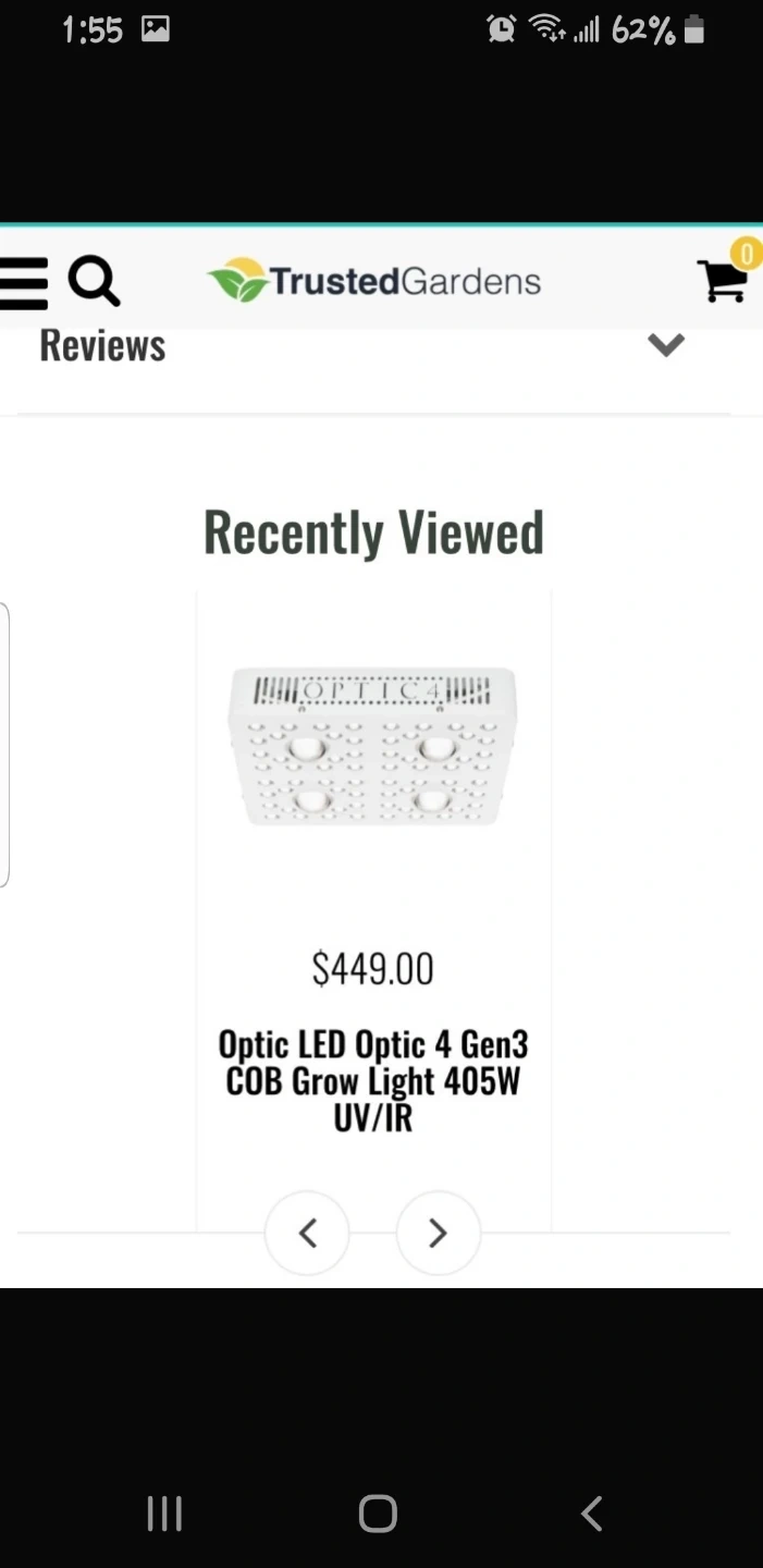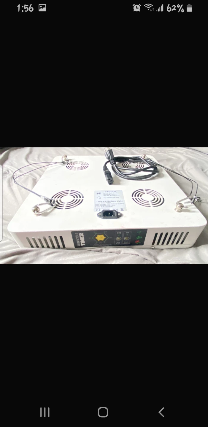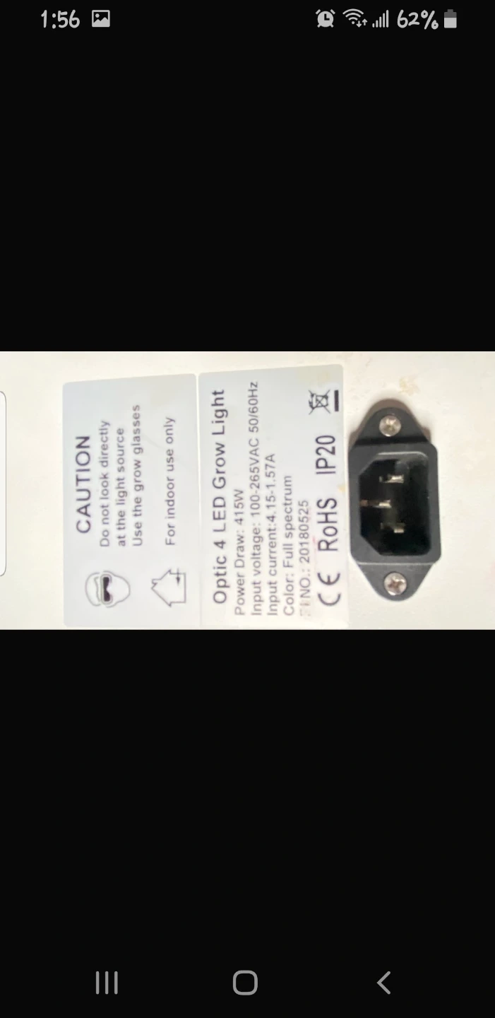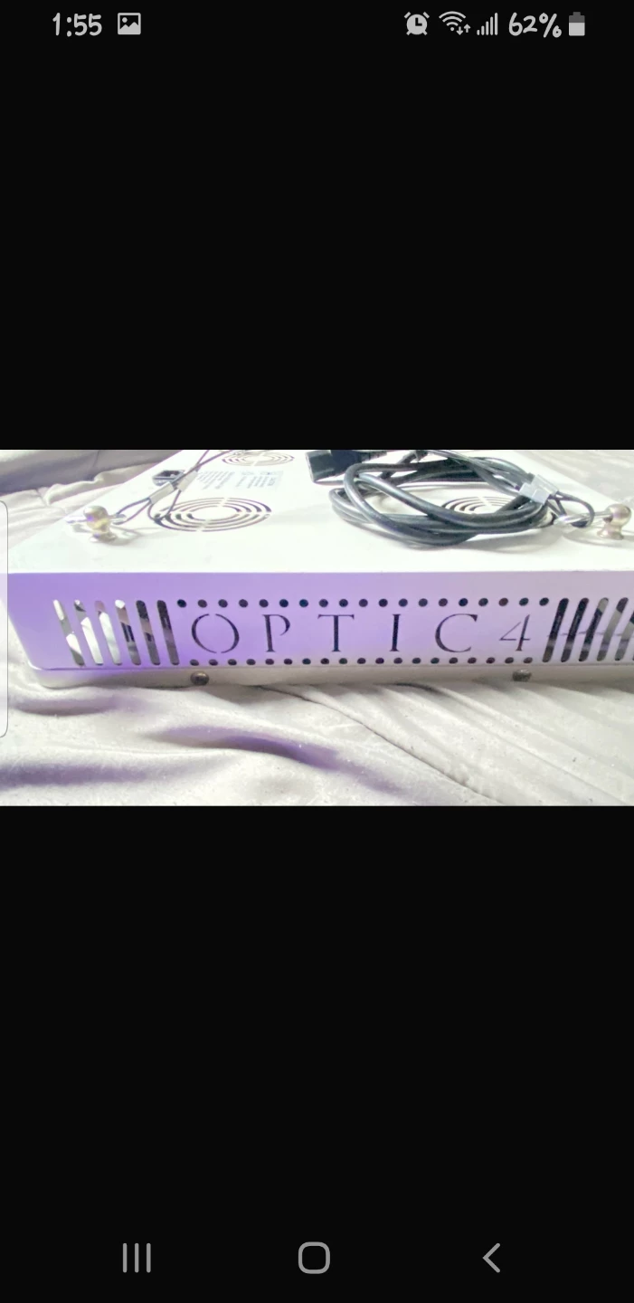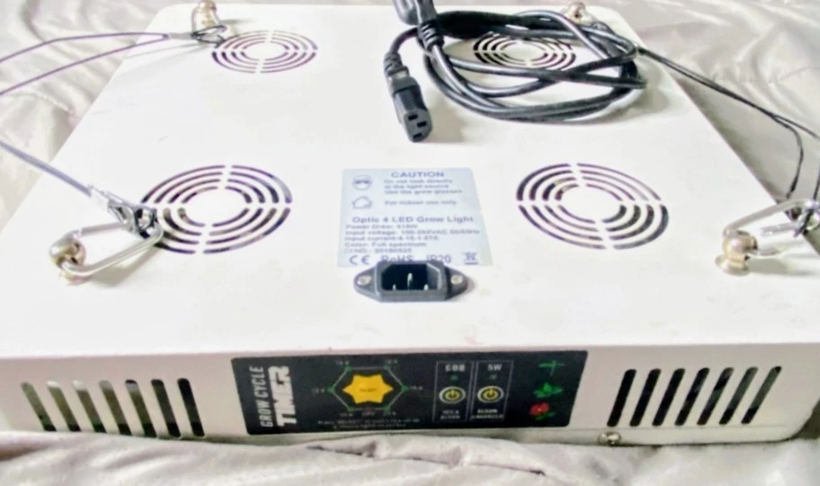 Selling an Optic 4 LED Grow Light. It has a power draw of 415W and an input voltage of 100-265VAC 50/60Hz. Input current is 4.15-1.57A. The colour is full spectrum.