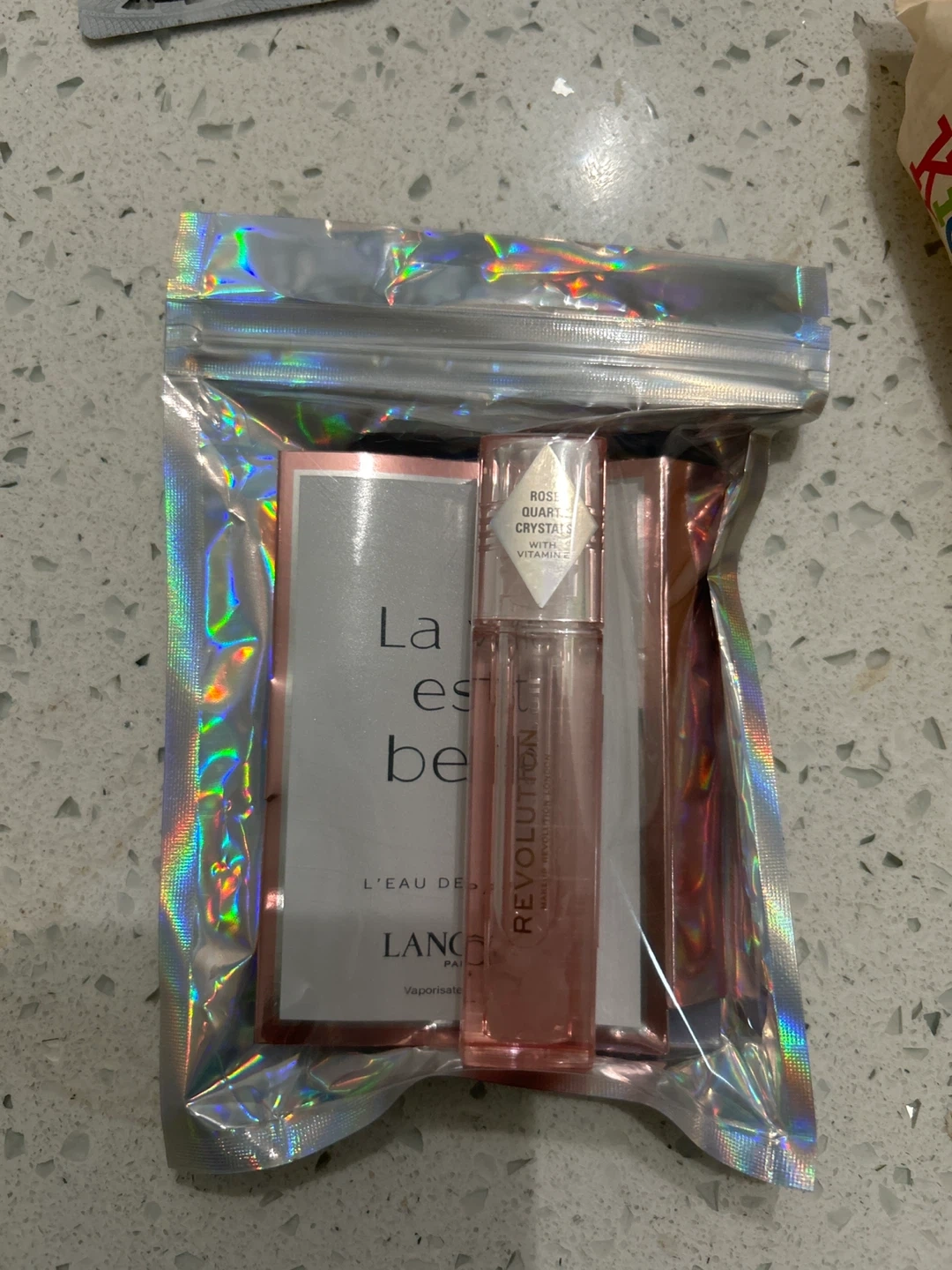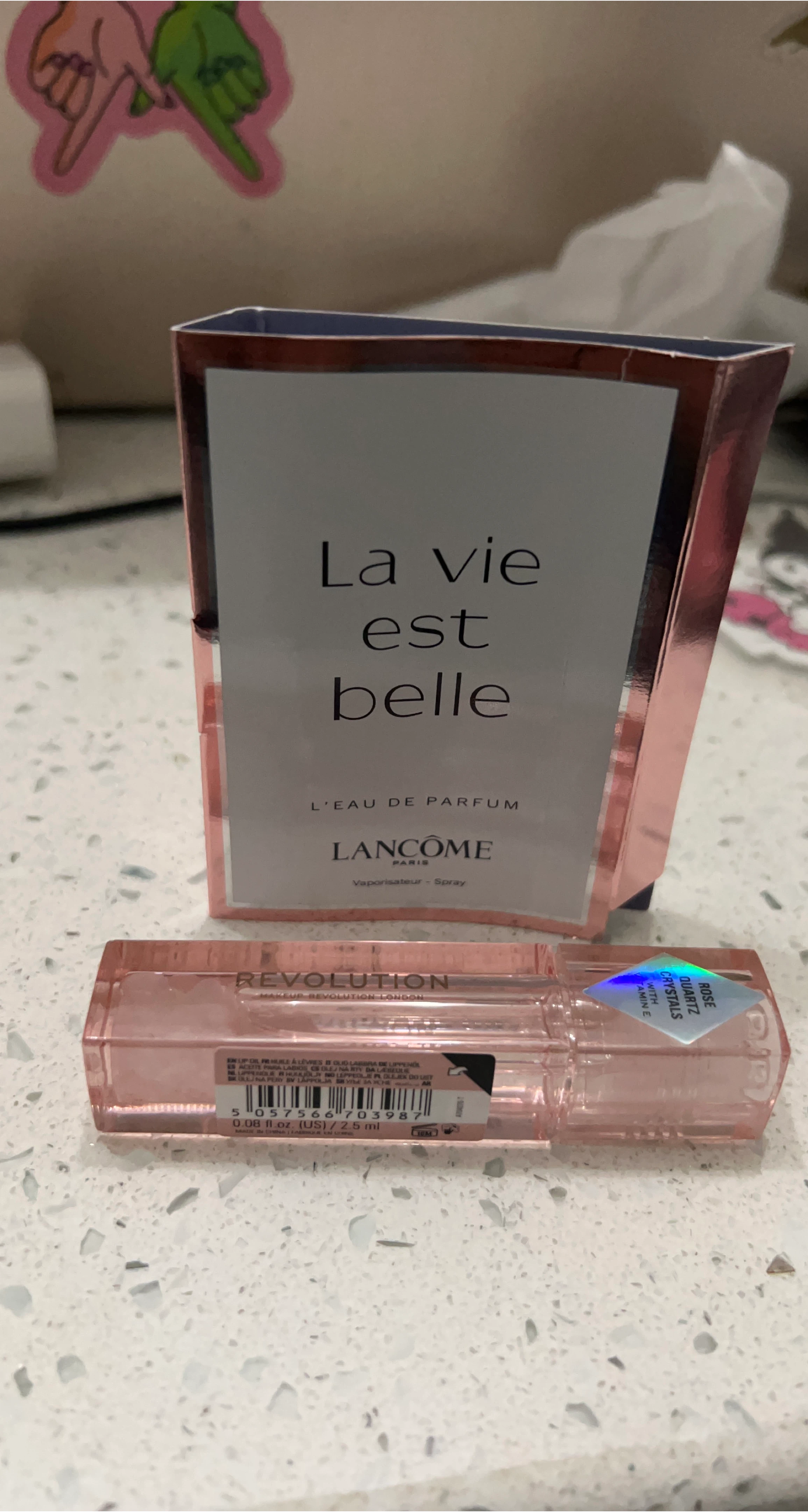 This set includes a Lancome La Vie Est Belle Eau de Parfum (SAMPLE SIZE) and a Revolution Lip oil infused with Rose Quartz. The Lancome perfume is known for its lovely scent, and the Revolution Beauty product adds a touch of charm to your beauty collection